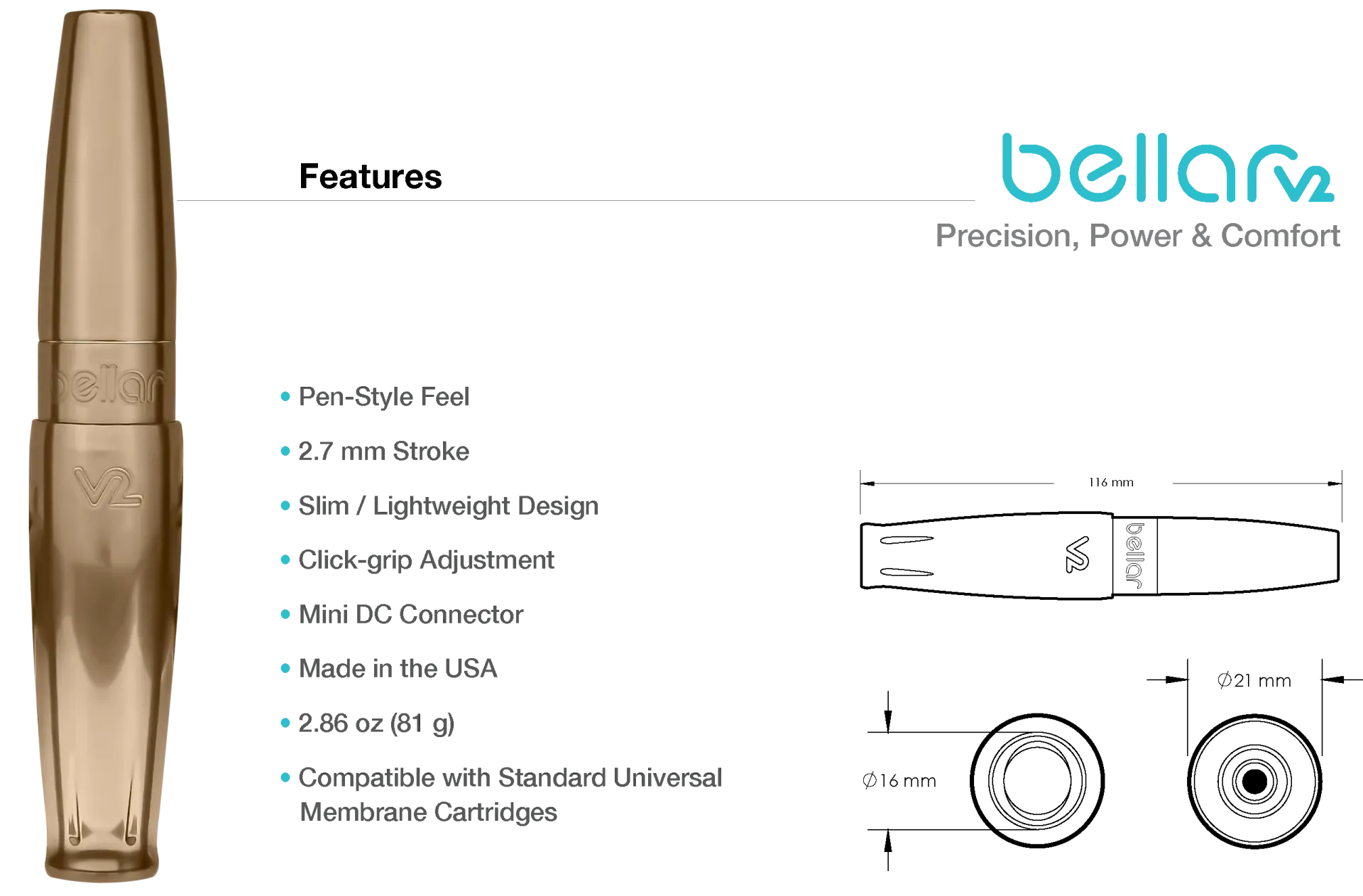 Bellar V2 съчетава красота и изтънченост с достъпна цена. На значително по-достъпна цена от предишното поколение, това устройство позволява на художника да разполага с луксозни PMU машини, без да се налага да плаща високи цени.