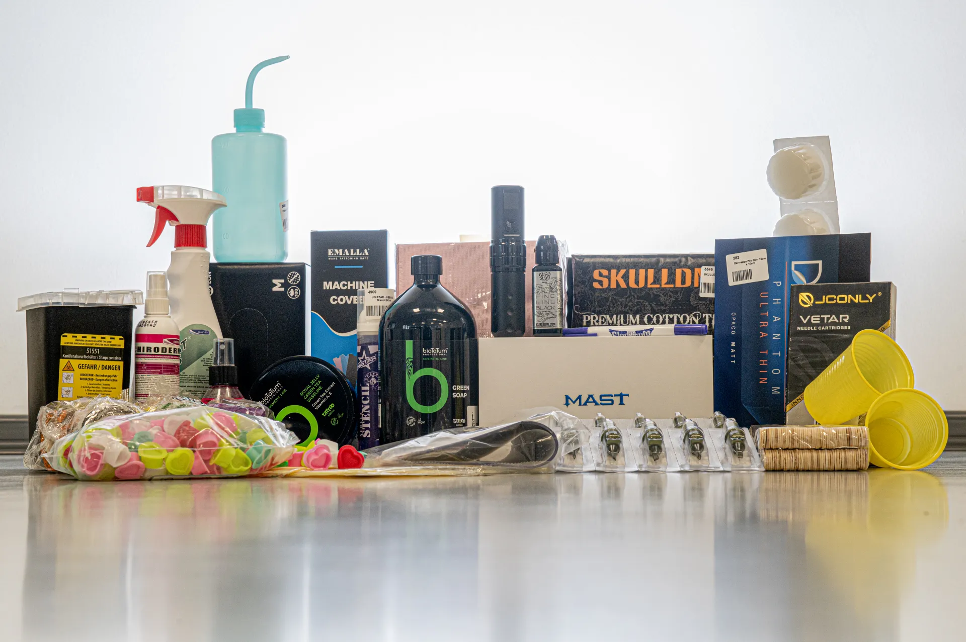 Комплектът включва и пълен набор от консумативи, като защитни покрития и бинтове за машината, cartridge игли, дезинфекция за кожа, работни повърхности и оборудване, сапун и бутилка с пипета, подложки, кърпи, ръкавици, контейнер за инфекциозни отпадъци, шпатули, както и препарат за премахване на прехвърления стeнсил от кожата.
