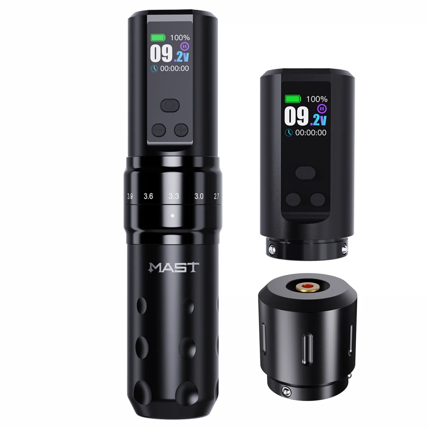 Най-важната част от комплекта е популярната безжична машинка MAST – FOLD 2 PRO с регулируем ход чрез завъртане от 2,4 мм до 4,2 мм, което я прави идеална за всички техники – контури, dotwork и сенки. Батерията с капацитет 2000 mAh разполага с голям и ясен дисплей и осигурява приблизително 7 часа непрекъсната работа с едно зареждане. Машинката се доставя с две батерии, а управлението им е лесно и интуитивно. Пълното зареждане отнема само 2 часа, което я прави надежден инструмент за тренировки и по-дълги сесии.