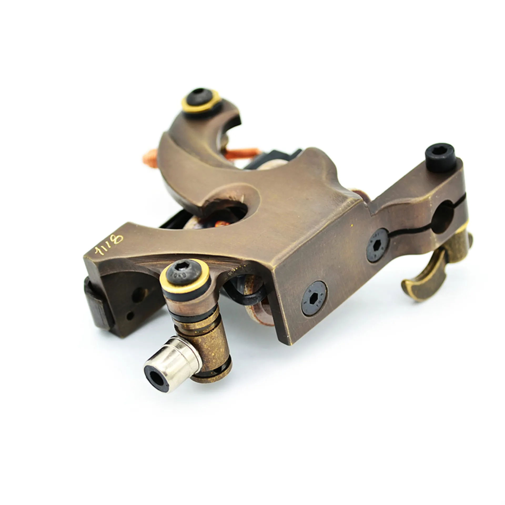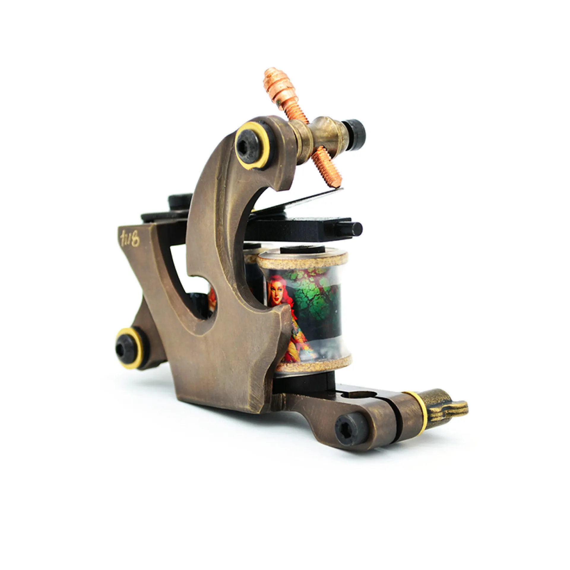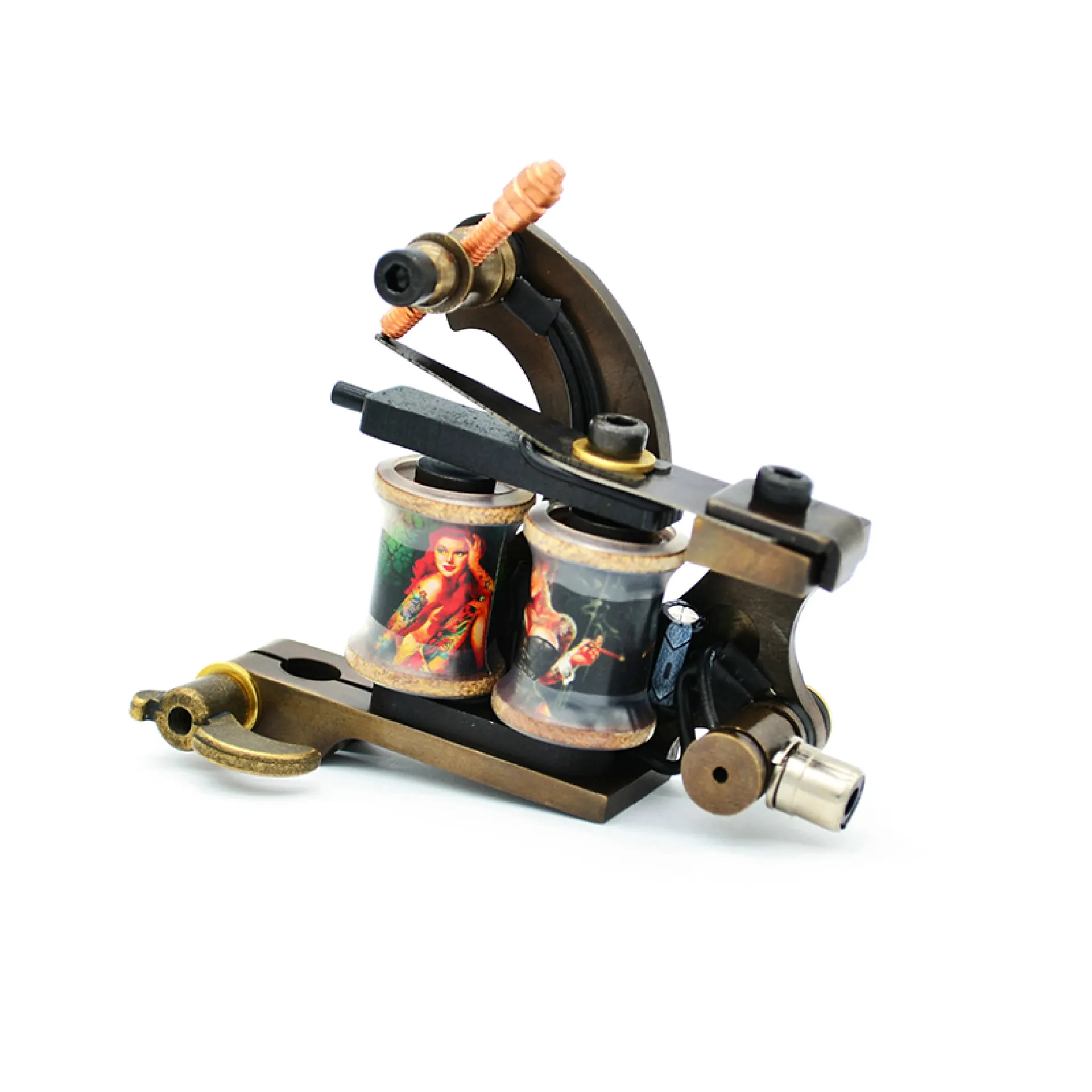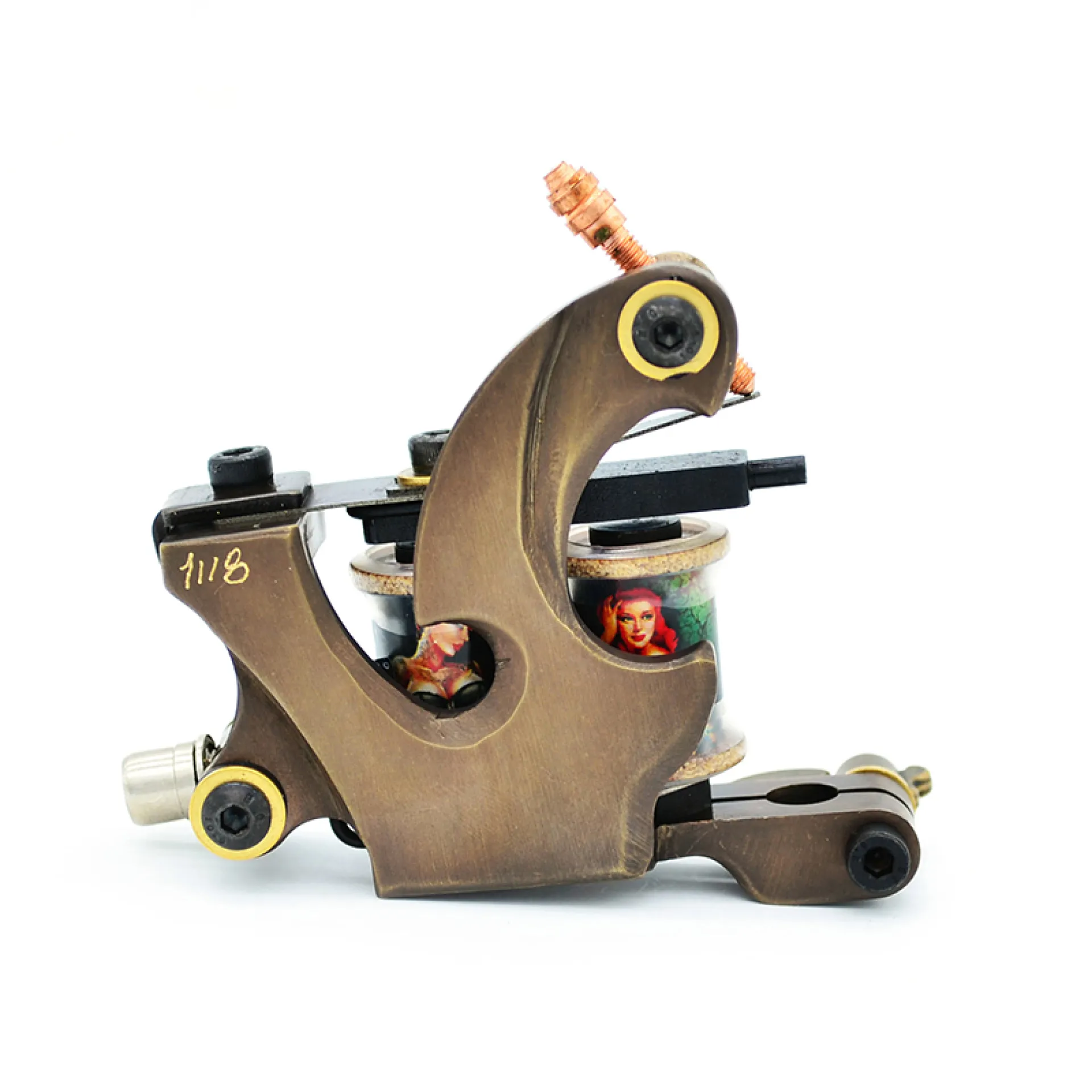 Машина за татуировки с бобина – класика, която никога не омръзва. Рамката е изработена от месинг с помощта на CNC, което придава на машината прецизни детайли във всяка посока. Оборудвана е с ръчно навити медни бобини, плочи от синя стомана и висококачествен контактен винт. Можете да свържете машината чрез класически clipcord кабел, а освен това разполага и с RCA конектор за използване с удобен RCA кабел.