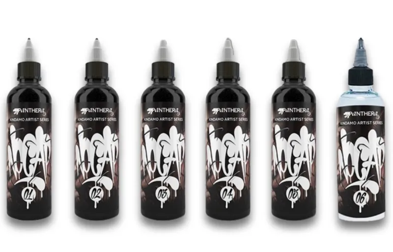 Сътрудничеството между реномирания италиански бранд Panthera Ink и световноизвестния татуист Kindamo доведе до създаването на ексклузивен комплект черни нюанси, проектирани специално за стиловете Black & Grey и Chicano. Panthera Ink е престижна италианска марка, позната по целия свят със своите висококачествени татуировъчни мастила – особено черни и сиви тонове. Тя е синоним на надеждност, качество и дълготрайни резултати. Италианският татуист Kindamo се прочу със своя характерен стил, който впечатлява с комбинация от реализъм и илюстрация. Този комплект е създаден с акцент върху прецизност, наситен контраст и плавни преливки – именно тези елементи определят художествения почерк на Kindamo.
