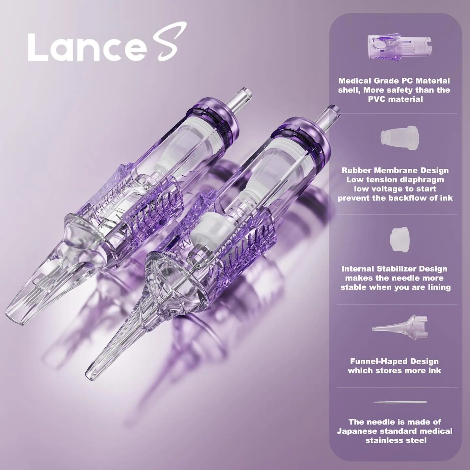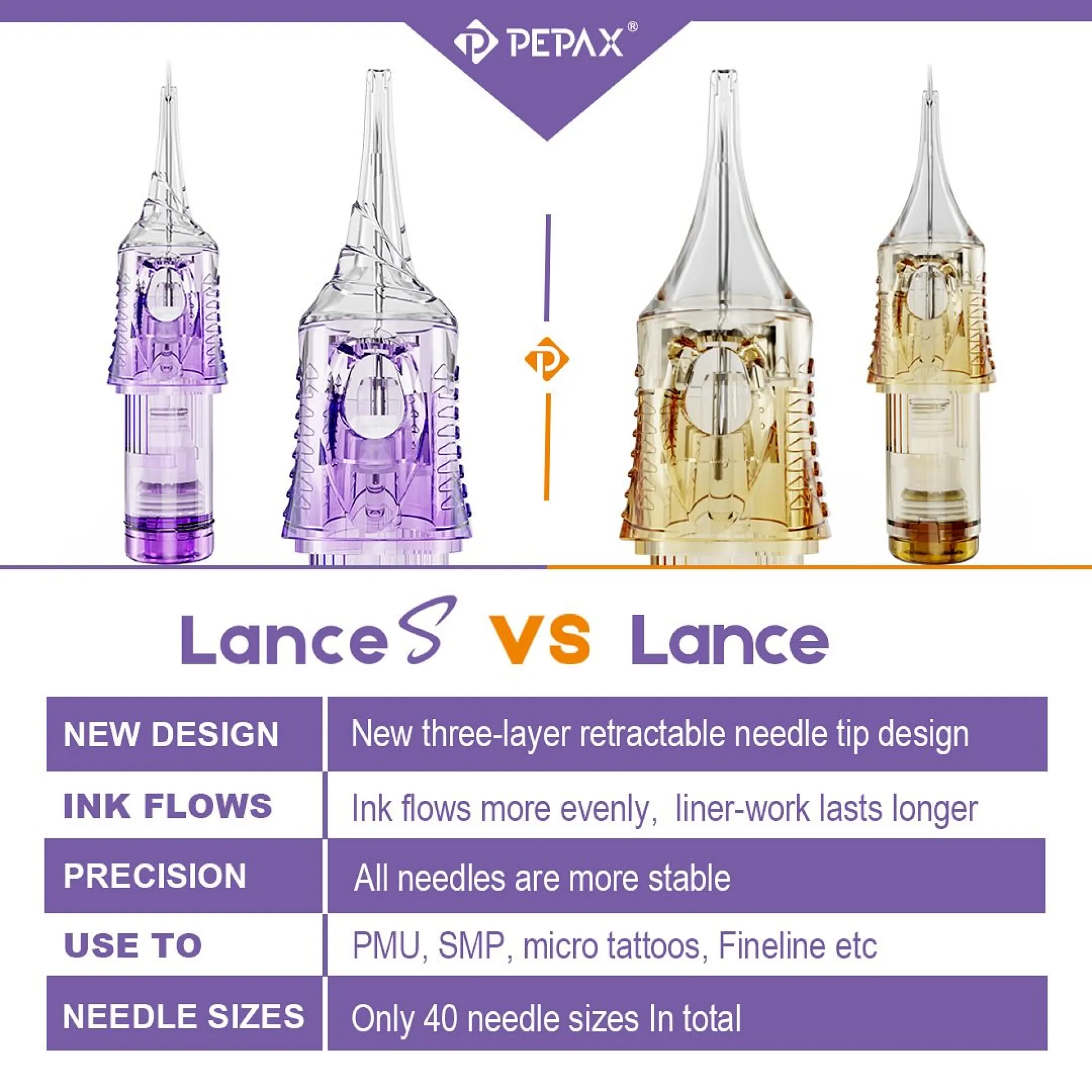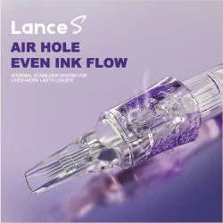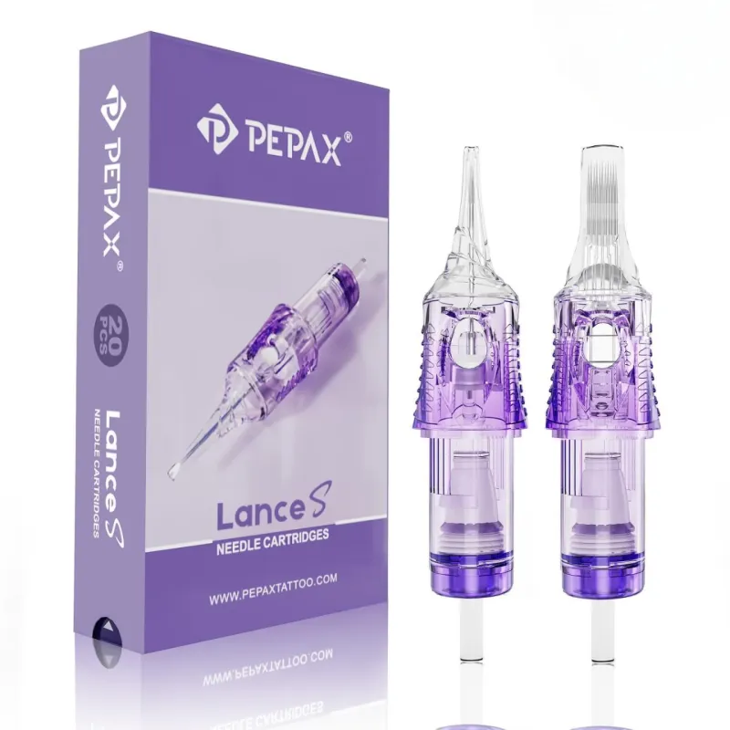 PEPAX LANCE S PMU са професионални игли тип „картридж“, изработени от висококачествена японска стомана, монтирани в прецизна пластмасова отливка от най-висококачествена фармацевтична пластмаса. Разбира се, има ръчно поставяне на иглата и мембрана, която предотвратява обратния поток на боя или вода в машината. Освен това, мембраната използва мек силикон, което прави движението много по-плавно, отколкото при обикновената гума, а моторът има по-малко съпротивление, което увеличава живота му. Специалната характеристика на иглите PEPAX LANCE S е полупрозрачният лилав пластмасов дизайн и квадратната пластина, което прави стабилизацията много по-висока, отколкото при кръгла форма.