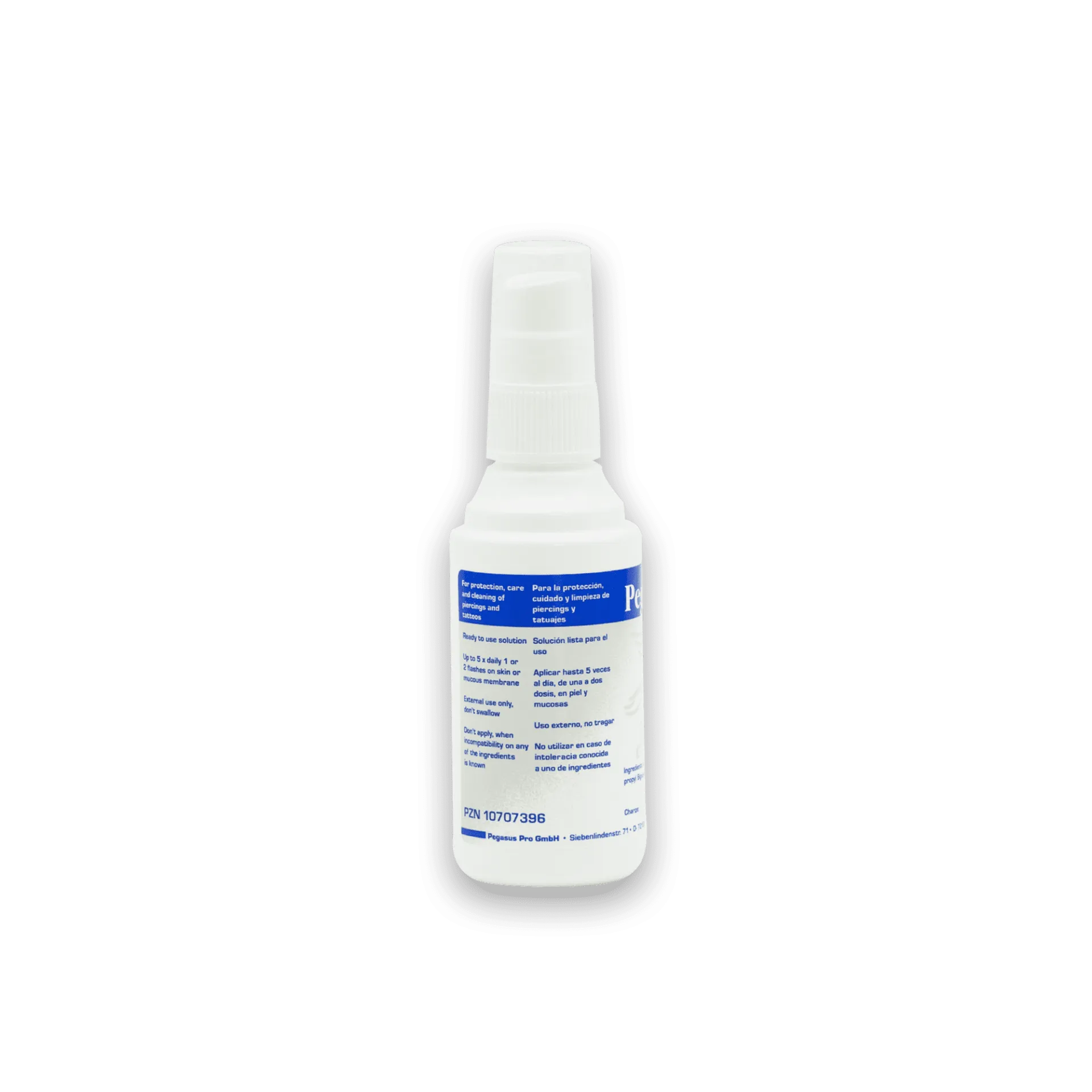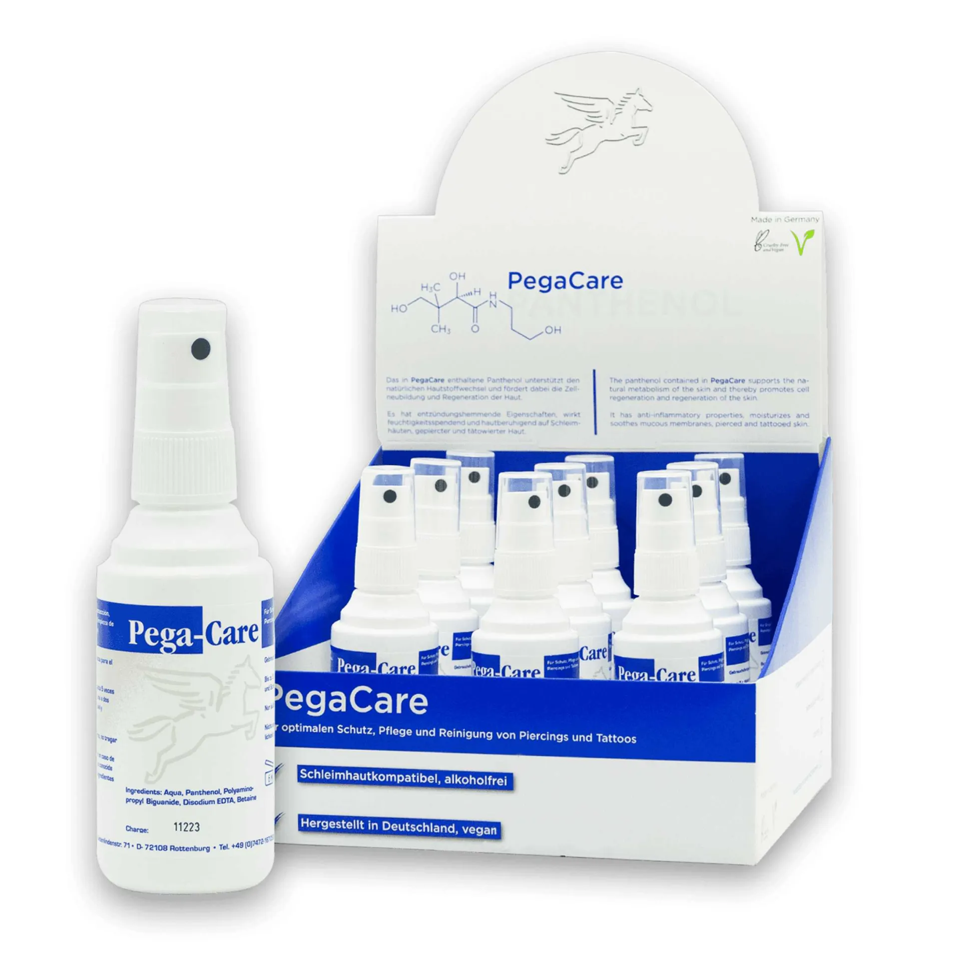 Pega-Care е разтвор на водна основа за грижа и почистване на пробити участъци от кожата и лигавиците. Продуктът е подходящ и за почистване на татуировки. Продуктът има подобрен ефект благодарение на пантенола. Всички съставки, съдържащи се в продукта, са дерматологично безопасни и не предизвикват дразнене на кожата. Pega Care не съдържа минерални масла и е 100% веган.