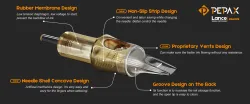 Най-новите картридж игли с предпазна мембрана от PEPAX. Пластмасовият корпус е изработен от медицински PC материал, който е по-безопасен от стандартния PVC. Иглата е изработена от стандартна японска неръждаема стомана с ръчно заточване и прецизно прилягане.