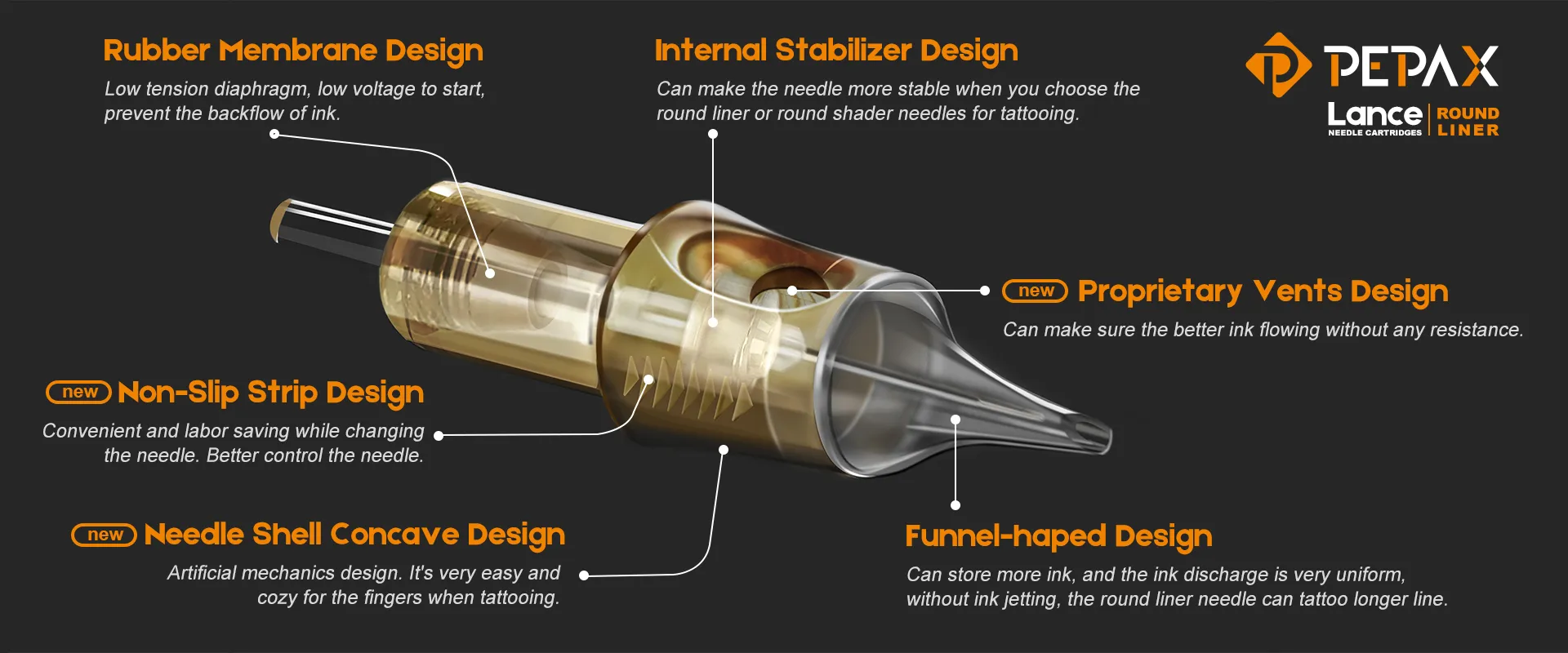 Най-новите картридж игли с предпазна мембрана от PEPAX. Пластмасовият корпус е изработен от медицински PC материал, който е по-безопасен от стандартния PVC. Иглата е изработена от стандартна японска неръждаема стомана с ръчно заточване и прецизно прилягане.