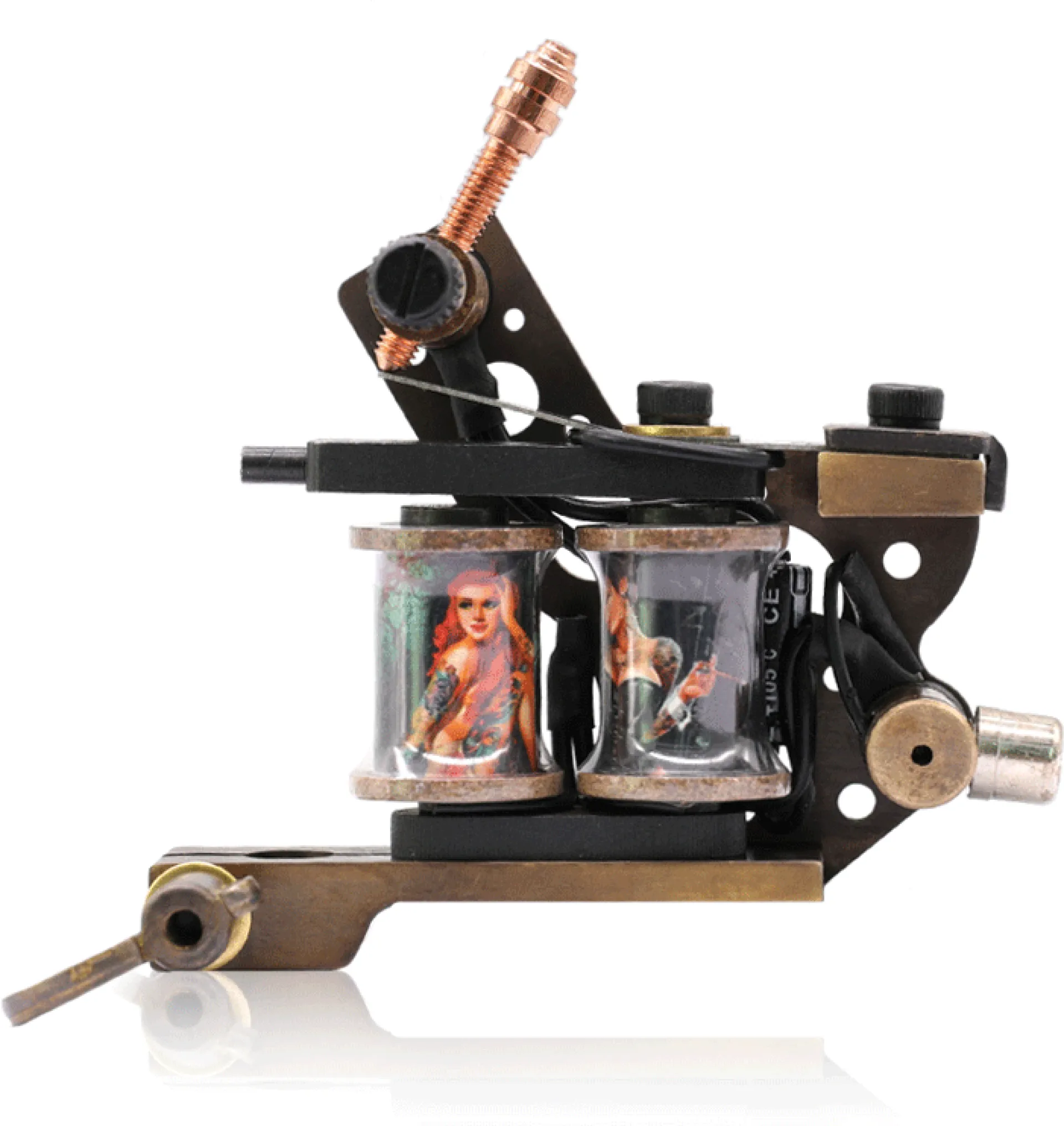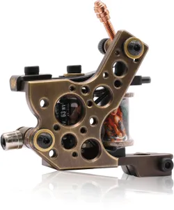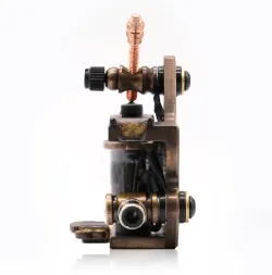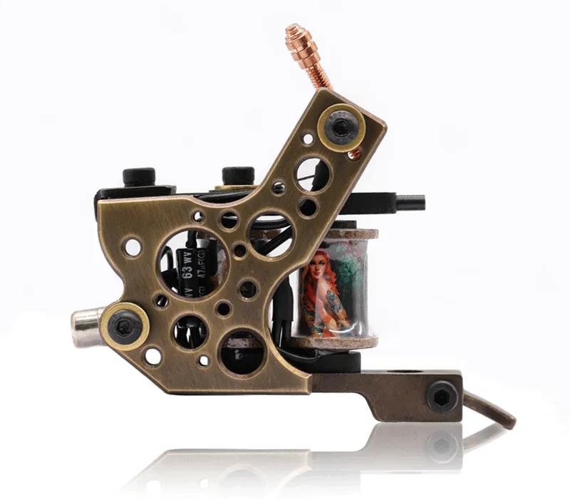 Машина за татуировки с бобина – класика, която никога не омръзва. Рамката е изработена от месинг с помощта на CNC, което придава на машината прецизни детайли във всяка посока. Оборудвана е с ръчно навити медни бобини, плочи от синя стомана и висококачествен контактен винт. Можете да свържете машината чрез класически clipcord кабел, а освен това разполага и с RCA конектор за използване с удобен RCA кабел.