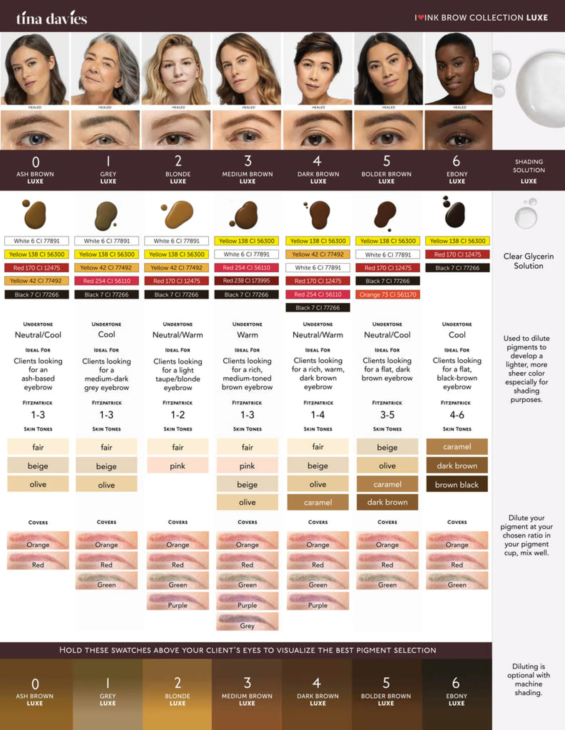 - Ash Brown LUXE: Страхотна класика. Този неутрален, хладен, средно пепелявокафяв пигмент е идеален за клиенти, търсещи вежди с пепеляв цвят. Фицпатрик 1-3.