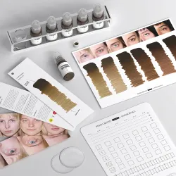 Комплектът съдържа шест нюанса, разделени на светли, средни и тъмни (01–06), което улеснява избора на правилния цвят. Всеки пигмент е балансиран, за да се превърне в красиви кафяви тонове след заздравяване. При нужда могат да се използват коригиращи пигменти (жълт или оранжев) или mixing solution за изсветляване и омекотяване на нюанса. Пигментите са част от линията PERMA BLEND LUXE, съобразена с нормата EU REACH.