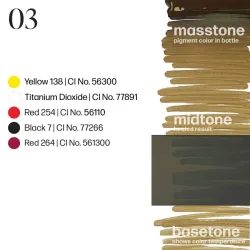 Пигмент 03 е универсален цвят, който след заздравяване дава неутрален резултат. Не се препоръчва за клиенти с естествено светли вежди, особено за тези, на които подхожда Пигмент 01 или 02, тъй като след заздравяване може да се получи по-хладен, дори сивкав тон.