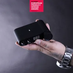Компактното захранване от португалския производител PIRANHA е много малко захранване за татуировки с големи предимства. Управлението на този източник е много лесно и можете да направите всичко с един бутон. Този контролен елемент е достатъчно голям и ще бъде удобен за използване дори с ръкавици. Чрез завъртането му променяте диапазона на напрежение от 3 до 18V. Чрез кратко натискане и задържане, захранването превключва в режим Памет, където можете да запазите най-често използваните стойности и винаги да имате достъп до тях за кратко време. Освен всичко друго, захранването може да работи и без педал, като функцията му и в този случай е заменена от въртящ се бутон.