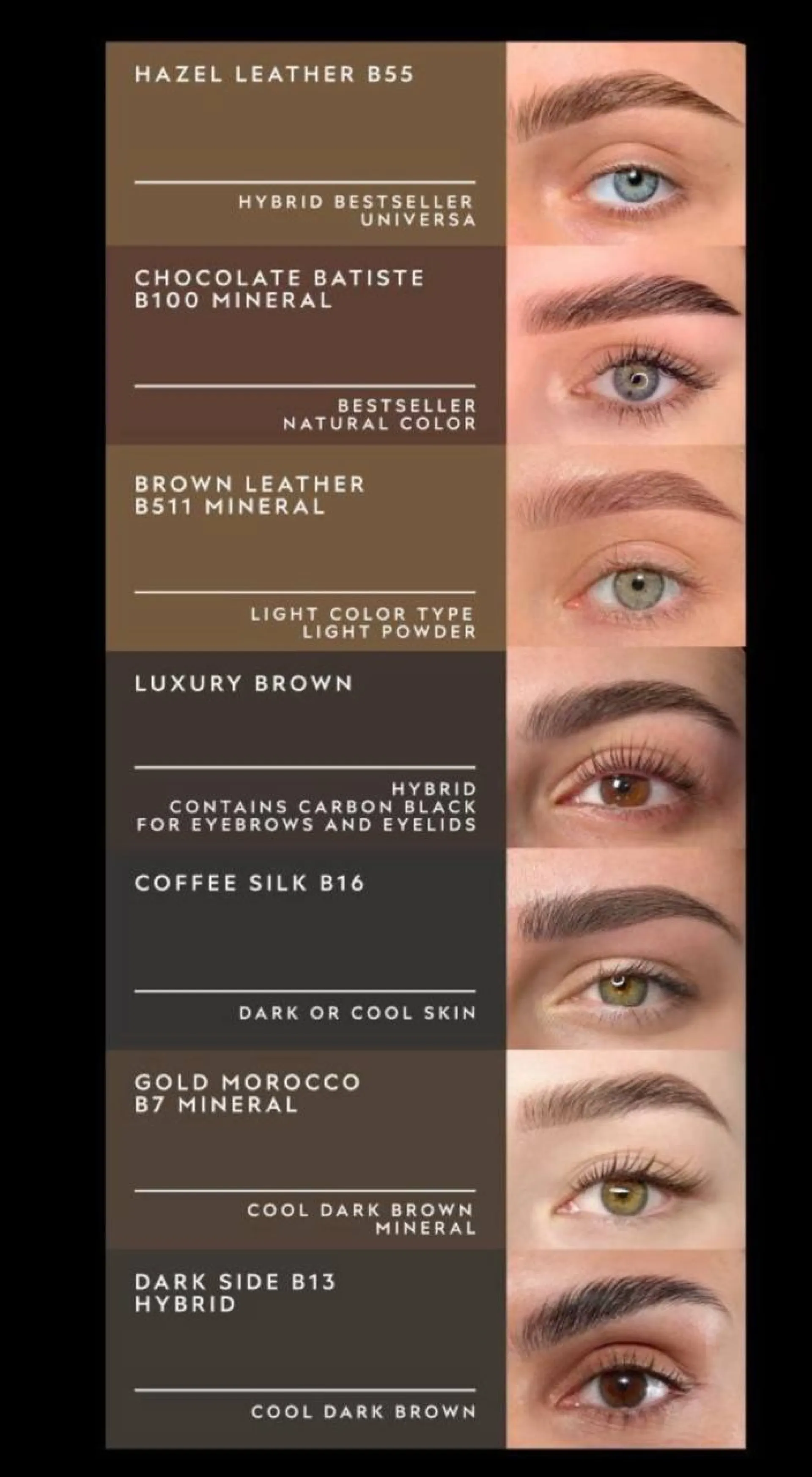 COFFEE SILK B16 е студен сиво-кафяв нюанс. Подходящ е за по-тъмна кожа и по-тъмна коса – идеален за създаване на изразителни и елегантни вежди. Често се използва в комбинация с HAZEL LEATHER B55.