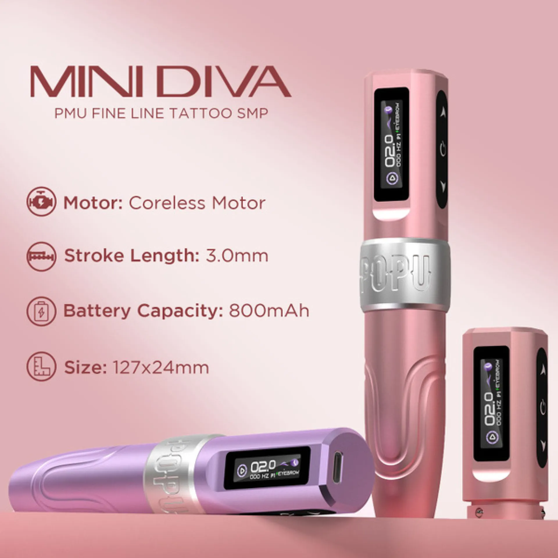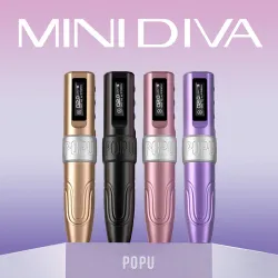 Безжичната MINI DIVA от POPU е по-малка версия на своята „по-голяма сестра“ DIVA, която запазва цялата производителност, но е по-лека и по-ефективна. Тежи само 110 грама с батерията, така че ръката ви няма да се умори дори след повече от два часа работа. Устройството има дължина на хода от 3,0 мм и избор от пет функции на PMU техниката - вежди, сенки, очна линия, контуриране/очертаване и устни. С 2V стартиране, MINI DIVA работи плавно дори при ниско напрежение, задоволявайки широк спектър от предпочитания. Машината е с най-новата система за абсорбиране на удари, което води до ниски вибрации и минимален шум по време на употреба, значително намалявайки умората на ръцете.