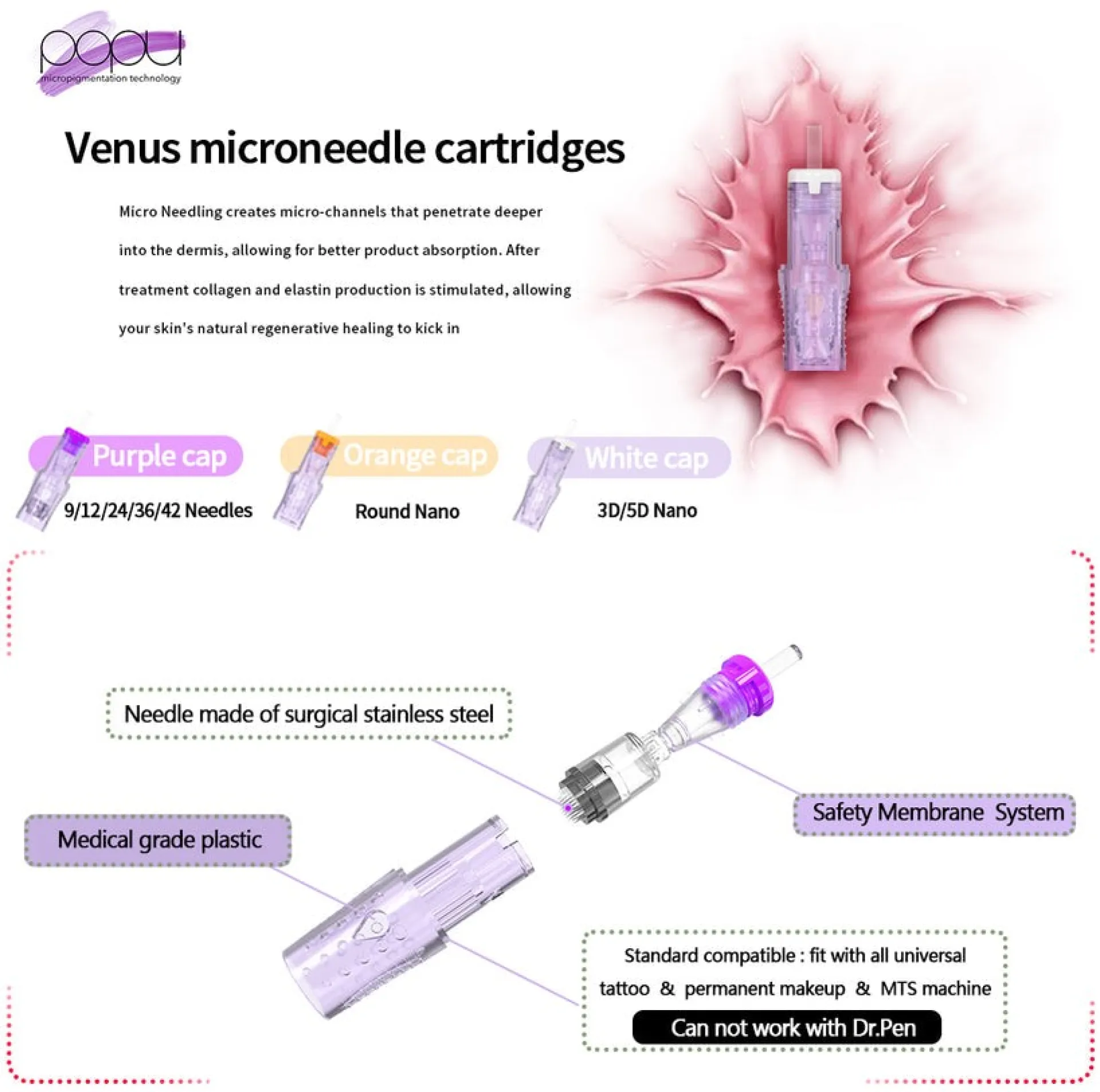 POPU VENUS MICRONEEDLING са идеални за всеки, който иска да извършва кожни процедури в допълнение към PMU. Те са съвместими с всички PMU машини от нашата гама. Това ви позволява да извършвате процедури за лице, без да се налага да купувате допълнително оборудване.