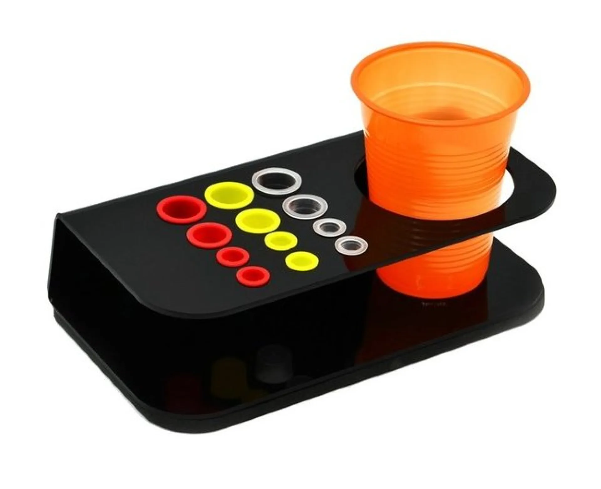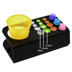 Поставка за пластмасови капачки с боя и чаша за изплакване на иглата. Поставката съдържа общо 12 отвора, в които можете да поставите капачки с размери S, M и L. 4 броя от всеки размер. Дъното е с неплъзгаща се повърхност и съдържа магнит, което определено ще оцените, ако притежавате метална работна маса.