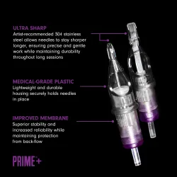Картридж иглите PRIME+ от американската марка PRIME TATTOO SUPPLY са създадени с цел да предложат професионално качество на достъпна цена, като отговарят както на нуждите на начинаещи, така и на опитни татуисти. Независимо дали става въпрос за фини линии, реалистично засенчване или наситени цветни запълвания, тези игли покриват всички техники и стилове. Те са стерилизирани с EO газ и изработени от медицинска пластмаса, което гарантира максимална хигиена и безопасност по време на работа. Разполагат с остри, прецизно наточени игли, които минимизират съпротивлението и намаляват дразненето на кожата, осигурявайки по-гладък процес на татуиране. Мембранната система ефективно предотвратява обратен поток на кръв и мастило към машинката, удължавайки нейния живот и повишавайки нивото на хигиена. Картридж иглите PRIME+ са съвместими с всички ротационни машини от нашето предложение.