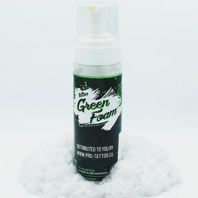 Антибактериалният зелен сапун - пяна се използва по време на татуиране, за да се избърше излишното мастило и кръв. Благодарение на пяната, той се свързва перфектно със замърсяванията и се абсорбира в кожата по-бързо от течност. Натуралните съставки, съдържащи се в сапуна, успокояват кожата и намаляват зачервяването. Освен всичко друго, продуктът е подходящ за почистване на кожата преди нанасяне на последваща грижа и фолио за нова татуировка.