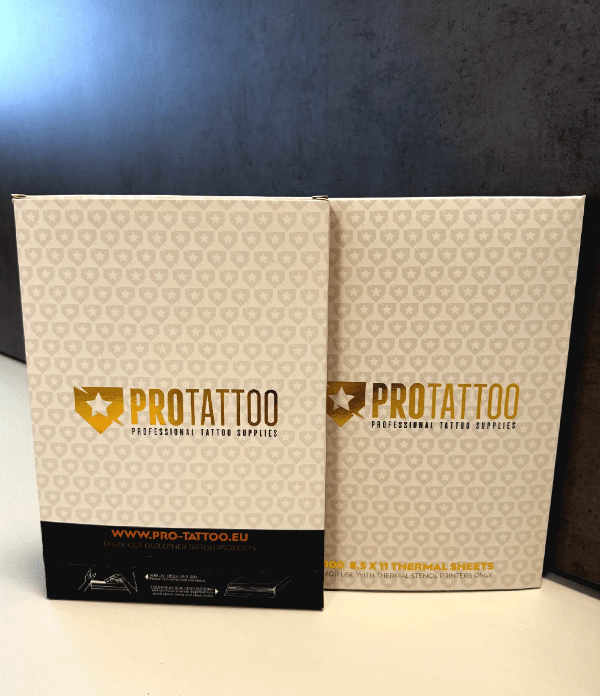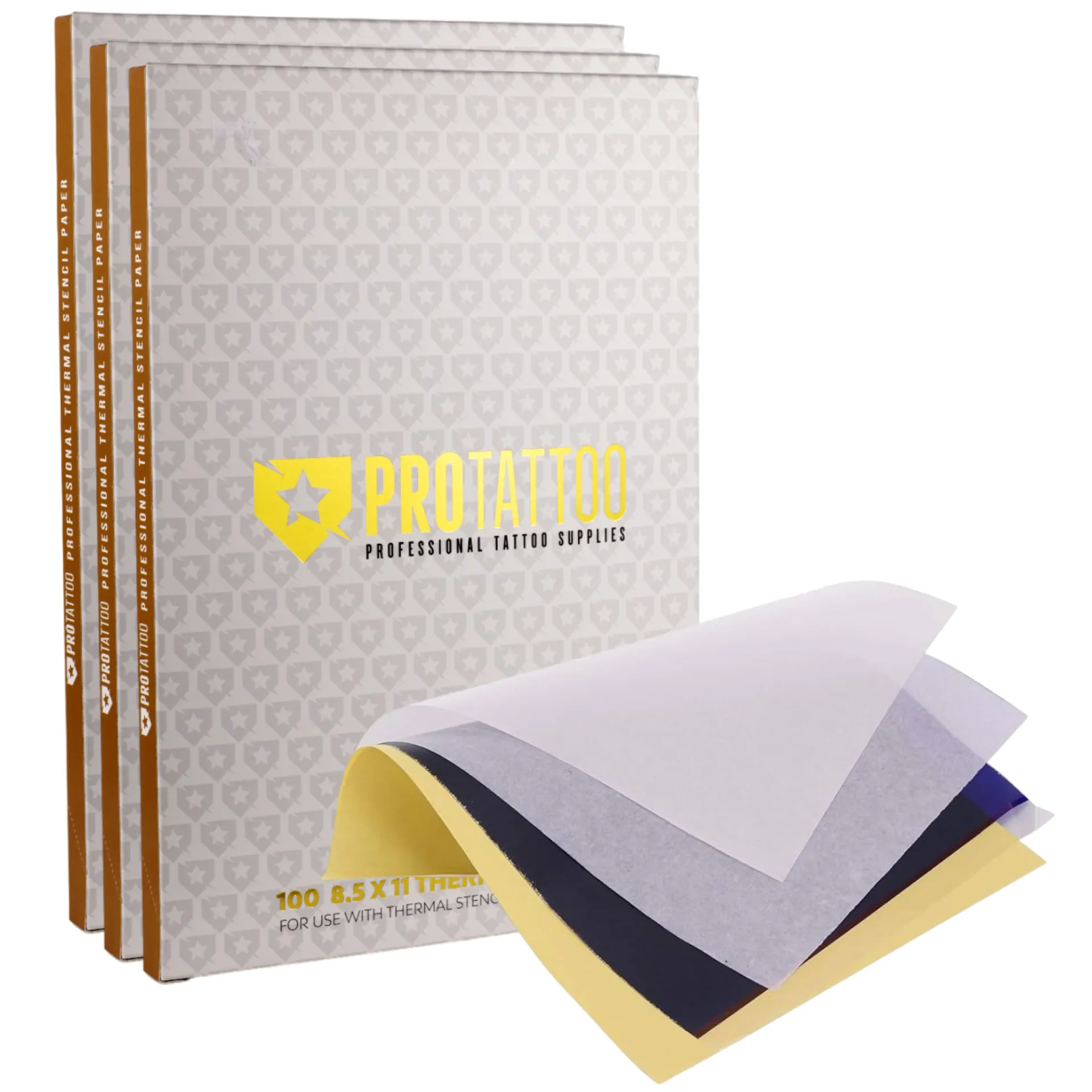 Доказаното качество на нашата марка се предлага с нови термохартии за принтери, които ще ви помогнат да постигнете дълготраен и прецизен шаблон. Хартията е трислойна и е подходяща за употреба с всеки термопринтер (Brother, OZER, AVA и други) или термокопирна машина. Хартията за татуировки Pro Tattoo е със стандартен размер и се предлага в опаковка от 100 броя.
