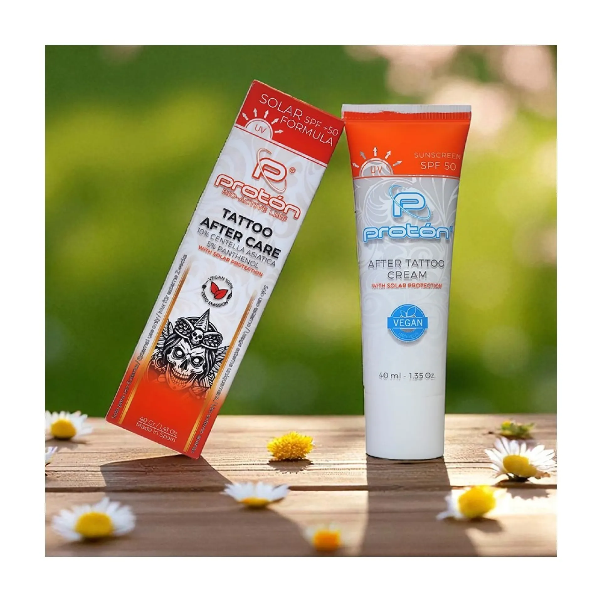 Proton Tattoo Solar After Care SPF +50 е специално създаден, за да защитава свежите татуировки от слънчевите лъчи. За разлика от обичайните SPF кремове за татуировки, този продукт е подходящ за нанасяне и върху пресни татуировки, като същевременно съчетава регенерация на кожата с SPF 50 защита, която е от съществено значение за запазване на цветовете, яркостта и здравето на кожата по време на заздравяване.