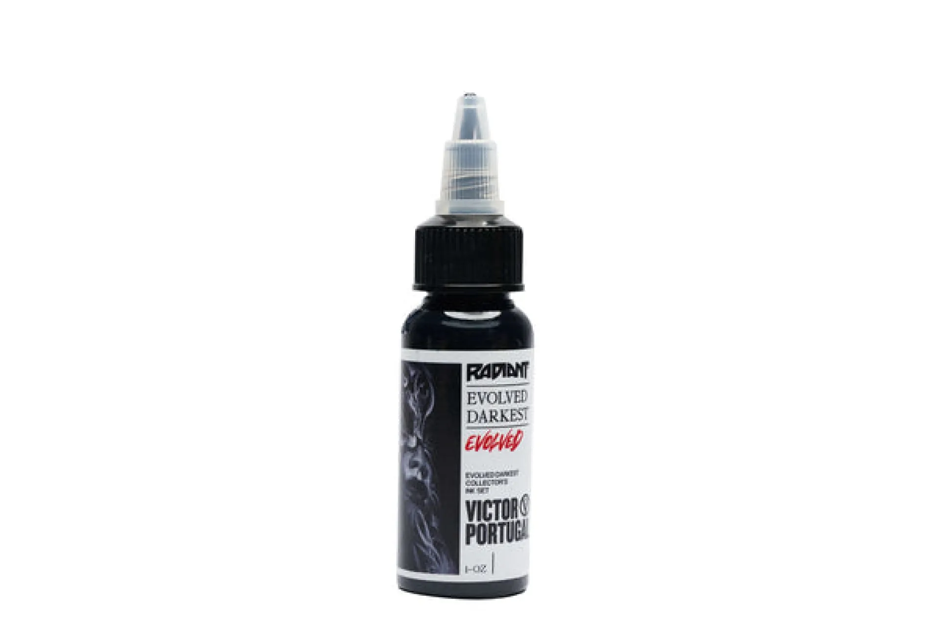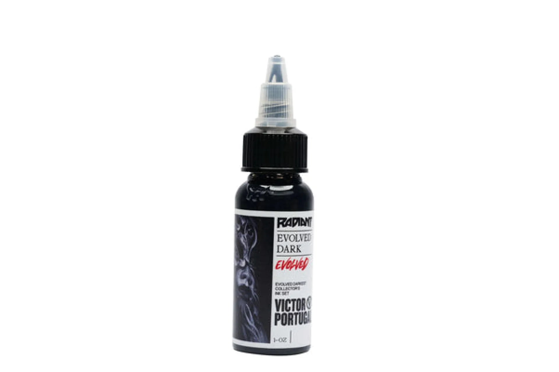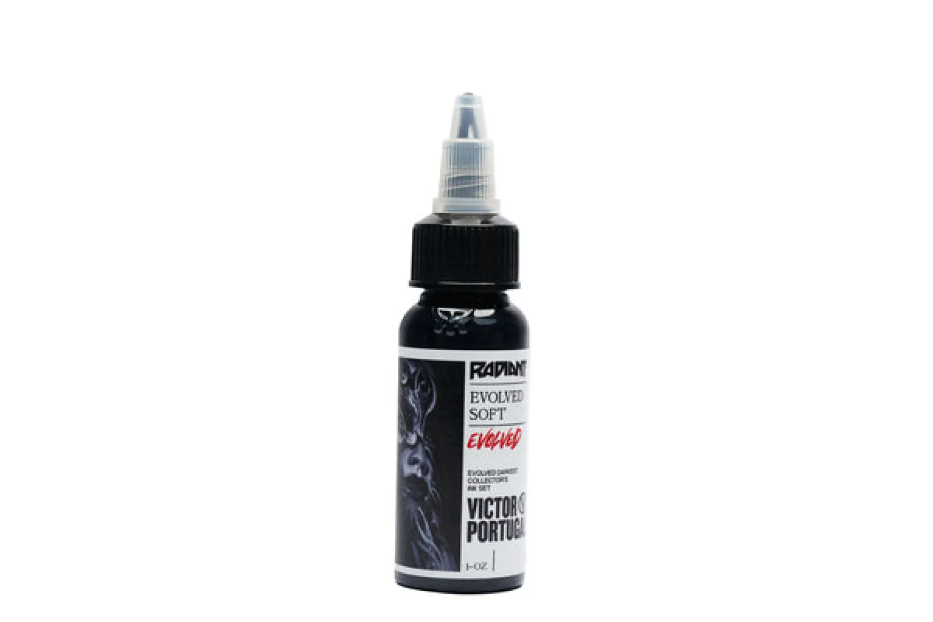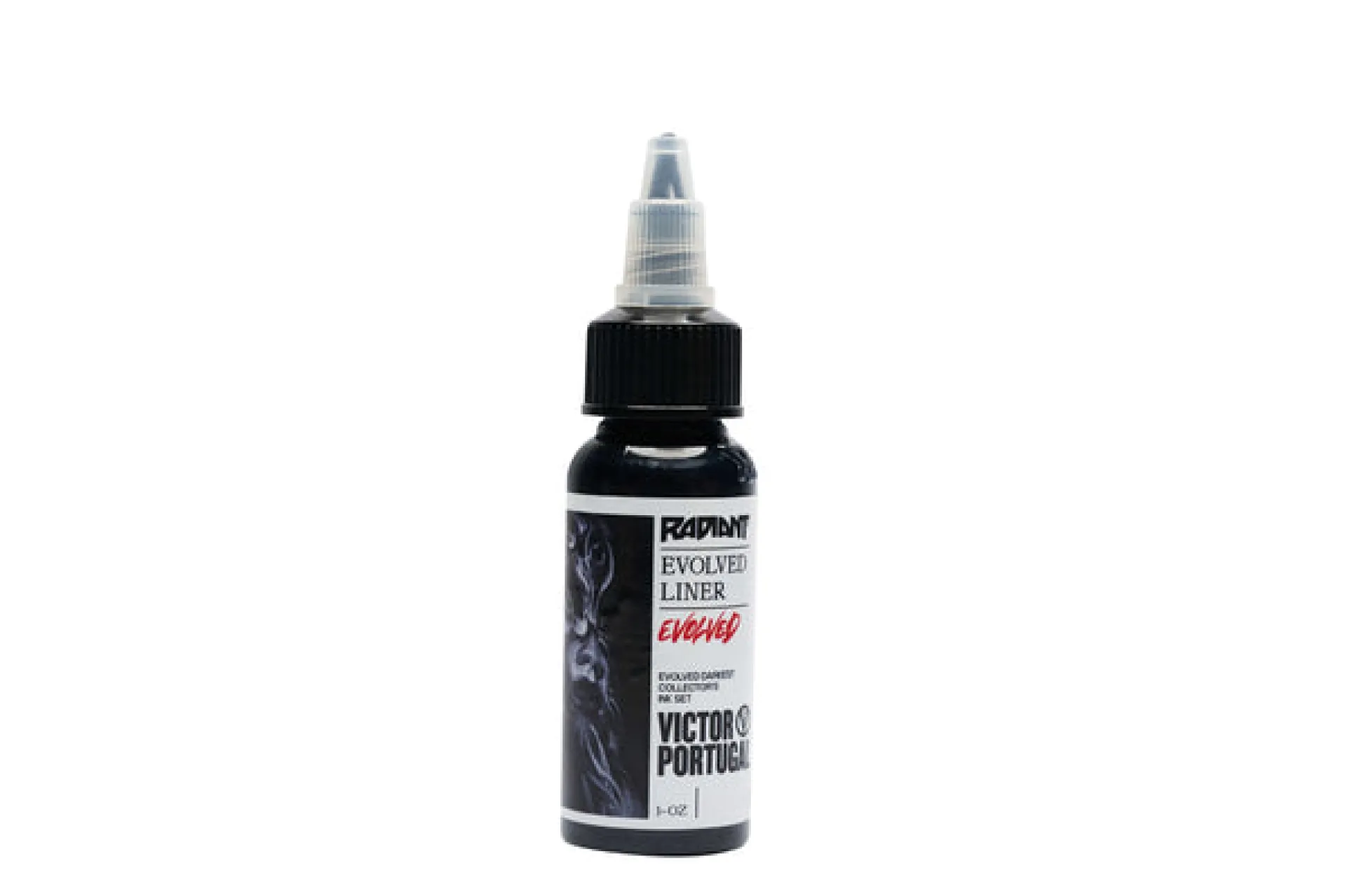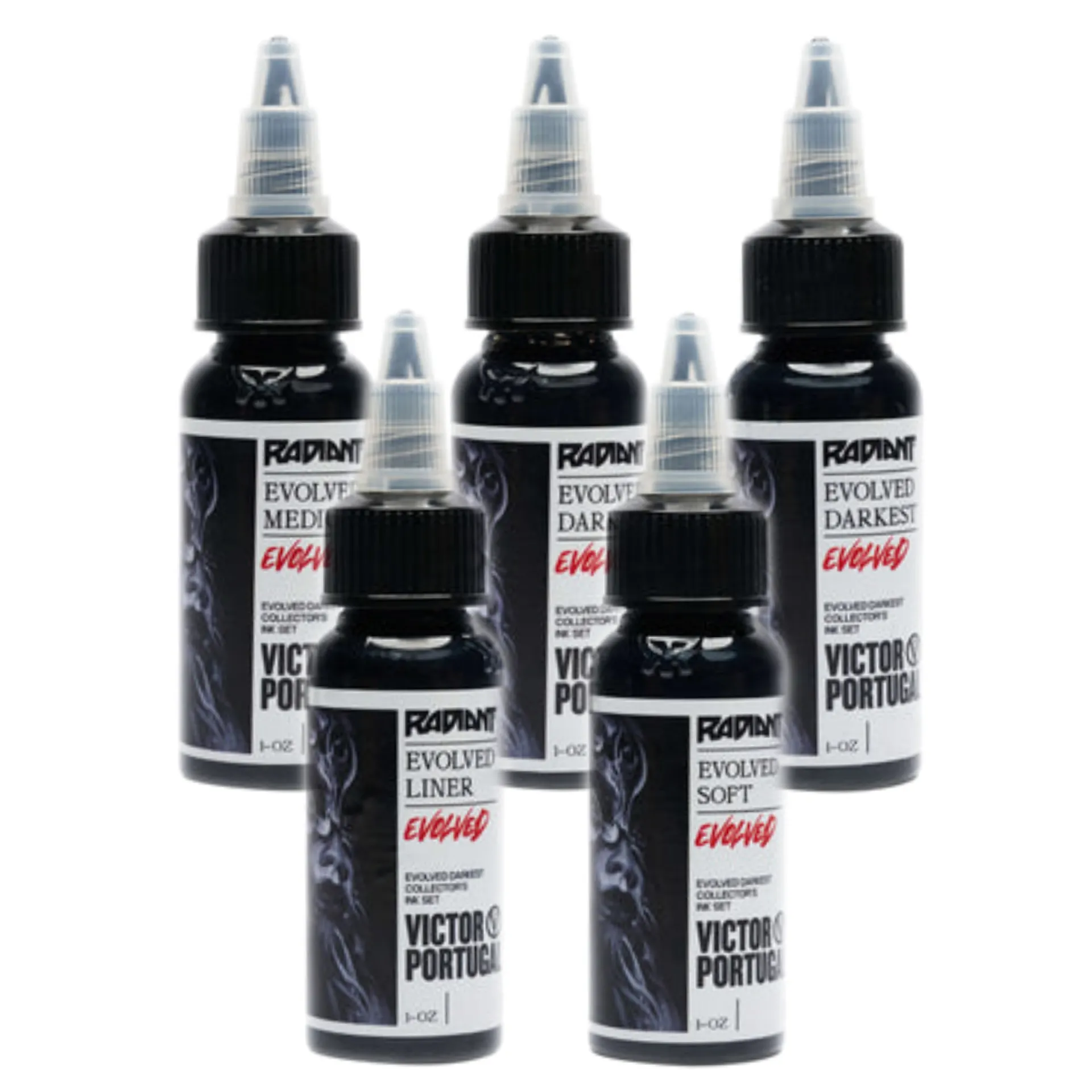 Комплект, създаден с доказаното сътрудничество на марката Radiant и известната икона за татуировки - Виктор Португал. Комплектът е подходящ за всички видове черно-бели татуировки. Съдържа черен лайнер и 4 нюанса за оцветяване, като най-тъмният нюанс „darkest“ е подходящ за запълване и blackwork. Линията Radiant Evolved е в съответствие с регламента TATTOO REACH 2023.