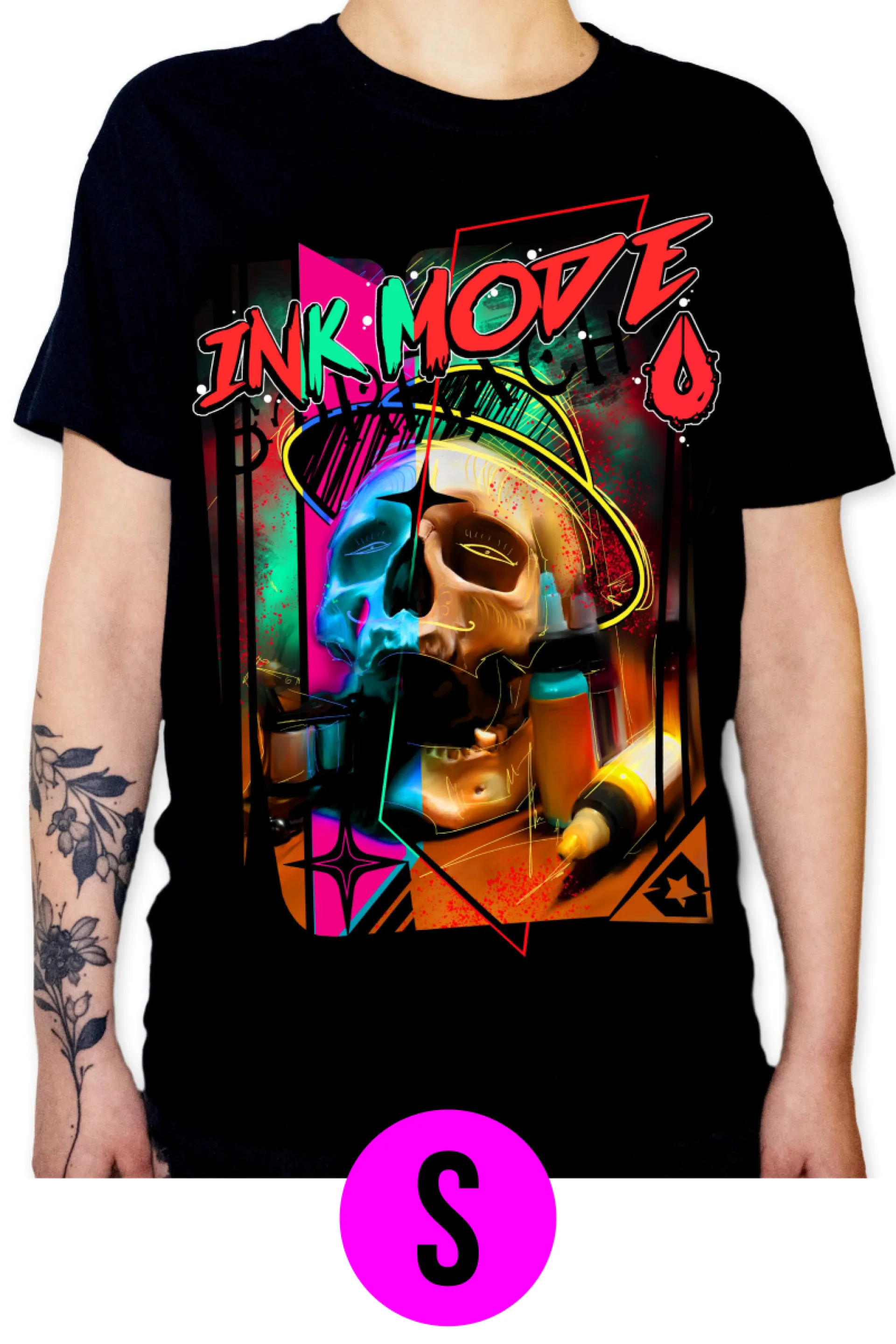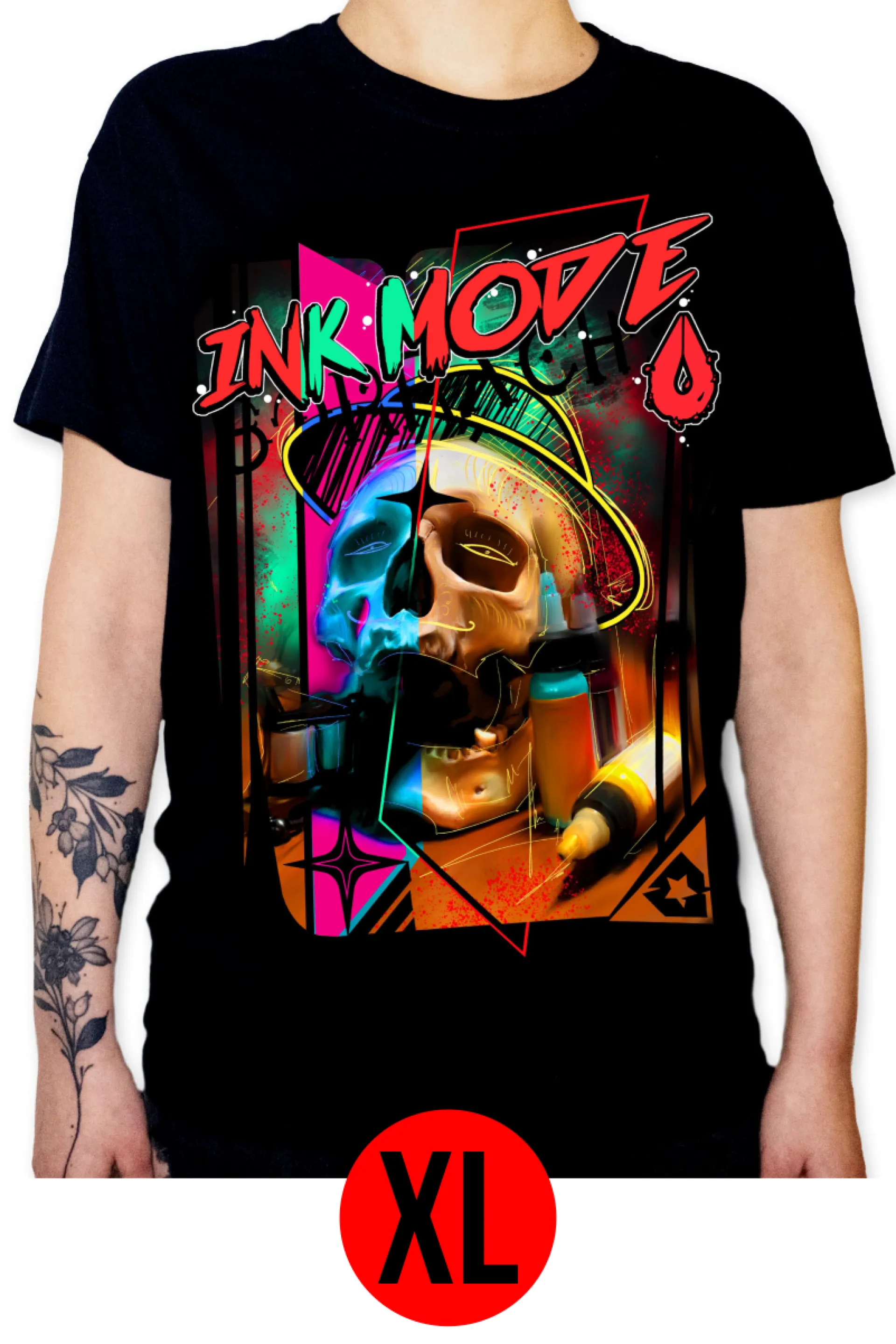 Превключете към РЕЖИМ МАСТИЛО. Нашата нова текстилна марка със собствен мотив за всички любители на татуировки. Както и при другите продукти на Pro Tattoo, можете да разчитате на най-високо качество и оригиналност с тези тениски. Ръчно рисуваният мотив е създаден от дългогодишния татуист и експерт в света на татуировките Игор от студиото за татуировки Energy Ink. Всеки мотив е редактиран до последния детайл и отпечатан с помощта на DTF технология с дълготрайни щампи, без да губи цвета си. Печатаме мотиви върху тениски SOL'S Imperial 190.