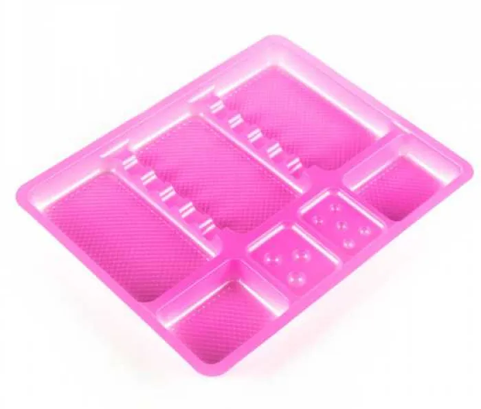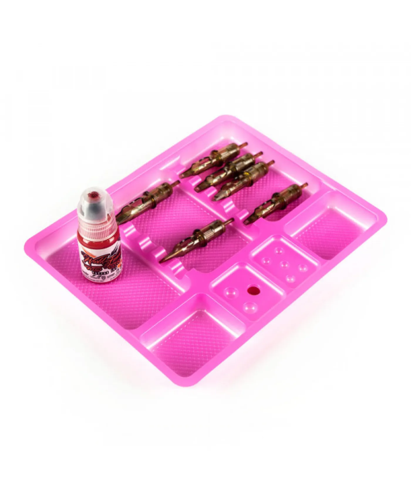Практично допълнение към всяко студио, където се поддържа 100% хигиена и ред по време на работа. Благодарение на тези пластмасови табли, вече не е нужно да поставяте машините, ръкохватките, накрайниците или чашките си на работната маса, където те лесно могат да паднат или да се замърсят.