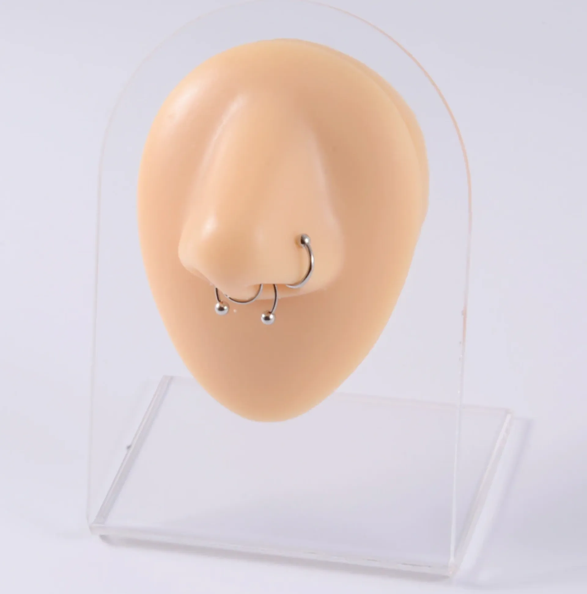 Силиконовият нос е подходящ за обучение по пиърсинг. След това можете да го използвате като допълнение към вашето студио, което със сигурност ще впечатли всеки посетител. Доставя се и с практична стойка.