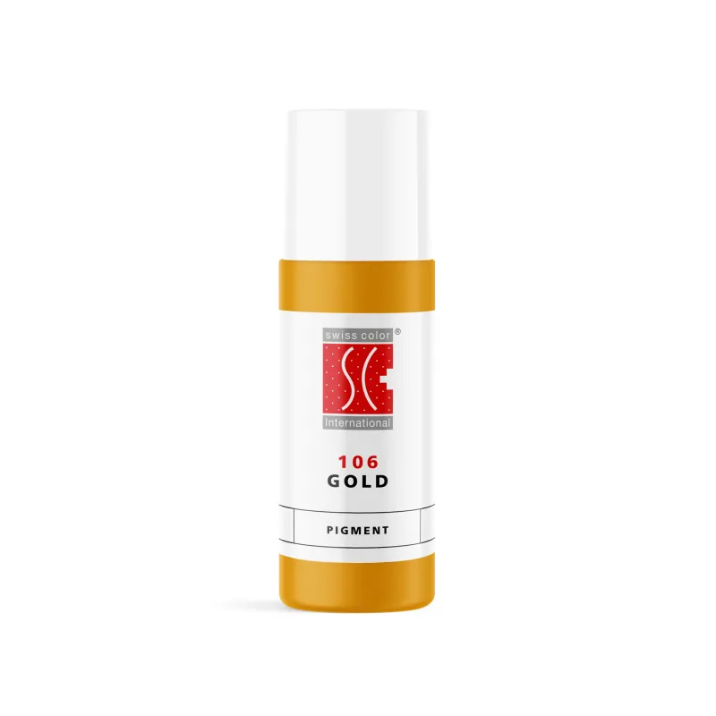 106 Gold – придава на веждите красив блондиран нюанс. Благодарение на неорганичния си състав увеличава трайността на другите цветове. При изсветляване на кафяви тонове използвайте 103 Orange за свеж вид и 106 Gold за естествен меден блонд ефект. Пигментът е високо концентриран и интензивен, затова се добавя постепенно и внимателно. Колкото повече 106 Gold се добави, толкова по-светъл ще бъде резултатът. Подходящ е и за смесване на цветове за устни, камуфлаж и пигментация на ареолата за естествен естетичен вид.