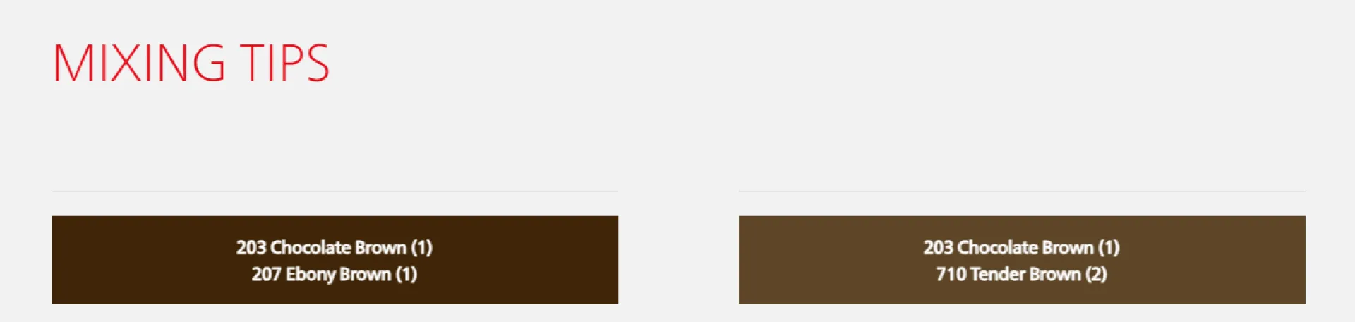- За естествен матов ефект на тъмни вежди: 203 Chocolate Brown (1), 710 Tender Brown (2)