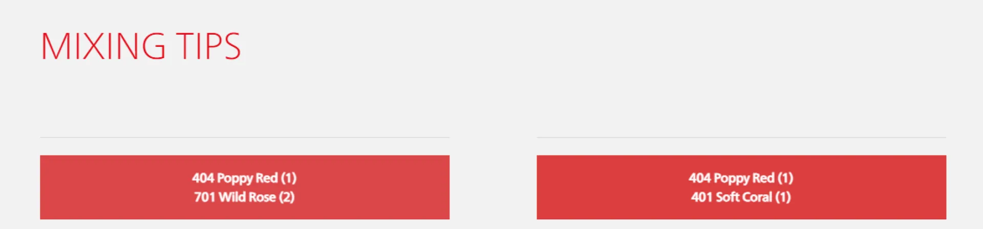 - Тази смес създава пудрово розов тон върху устните благодарение на увеличеното количество бяло: 404 Poppy Red (1), 401 Soft Coral (1)