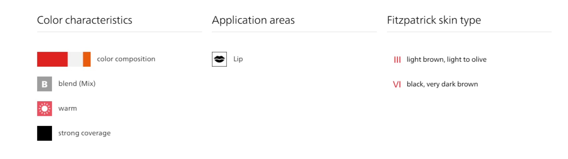 404 Poppy Red е интензивен цвят за устни, предпочитан от жени, които често носят червено червило – особено при типове кожа Fitzpatrick III до VI. Препоръчва се за смесване благодарение на своите оранжеви компоненти, които придават топъл оттенък на други пигменти. Основно се препоръчва като цвят за устни.