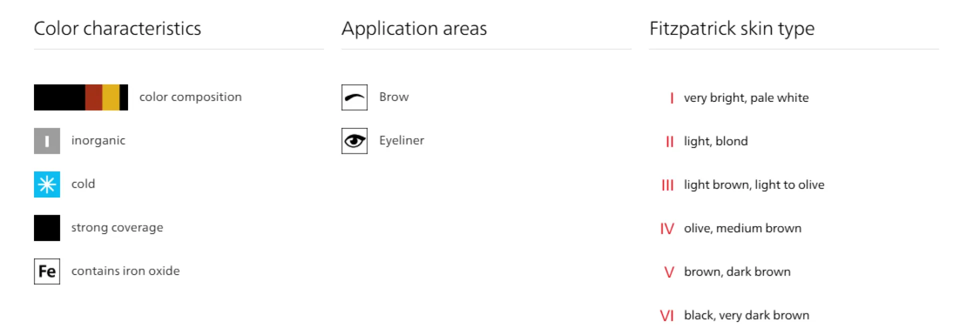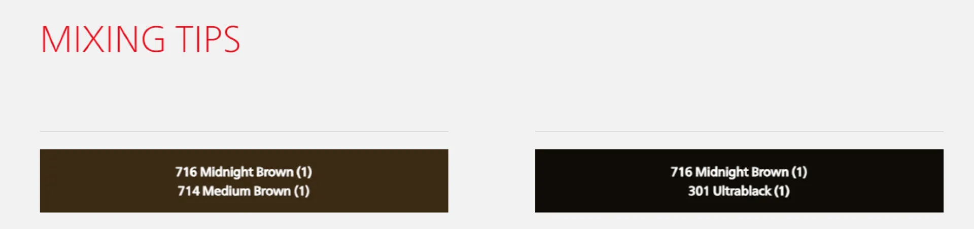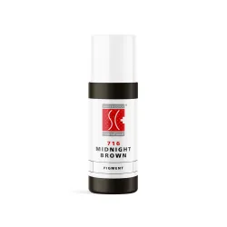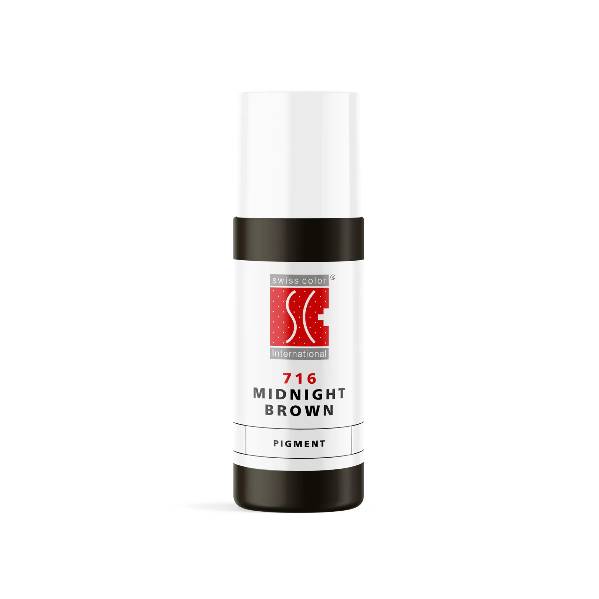 716 Midnight Brown – този пигмент създава пепеляво-студен ефект при типове кожа Fitzpatrick I–III и при по-тъмни типове кожа IV–VI изглежда като наситено тъмнокафяво. При смесване с 106 Gold се появяват маслинени отблясъци, които перфектно допълват средиземноморски, близкоизточни или югоизточноазиатски тонове на кожата с по-високо съдържание на меланин. Добавянето на 107 Terra дава хармоничен тъмнокафяв нюанс. Идеален за фино подчертаване на линията на миглите при по-зрели клиенти или при редки мигли. За средно пепеляви очни линии 716 Midnight Brown може да се комбинира с 301 Ultrablack за постигане на меки преходи.