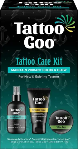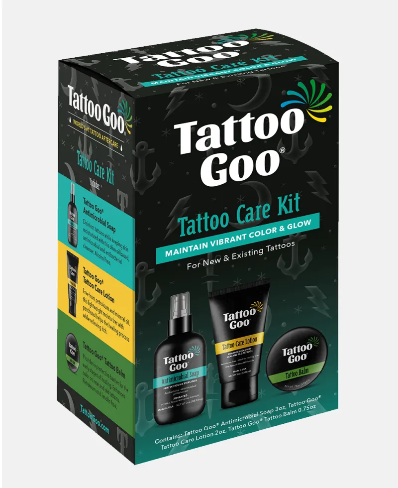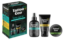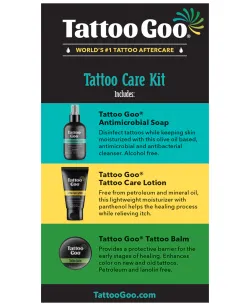 Комплект продукти за грижа за татуировки от известната американска компания Tattoo Goo. Комплектът съдържа общо 3 продукта за поддръжка на татуировка от първия ден до редовна грижа.