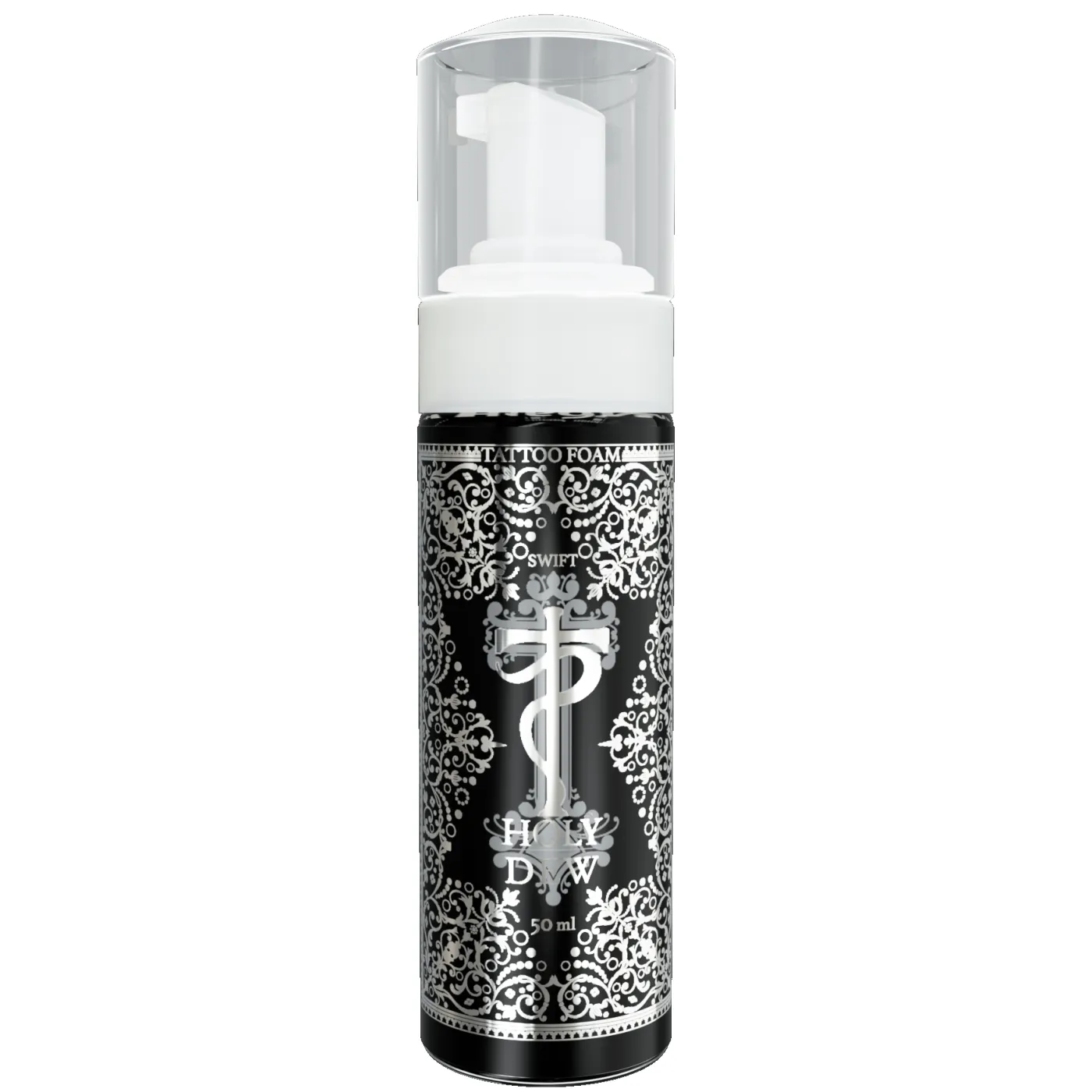 Holy Dew Swift е антибактериална пяна за почистване на кожата по време на татуиране и едновременно с това за грижа за нова татуировка. Продуктът почиства татуировки от всякакви видове замърсявания. Не е необходимо да добавяте сапун или вода при нанасянето му, така че може да се използва като продукт за последваща грижа при почти всяко състояние.