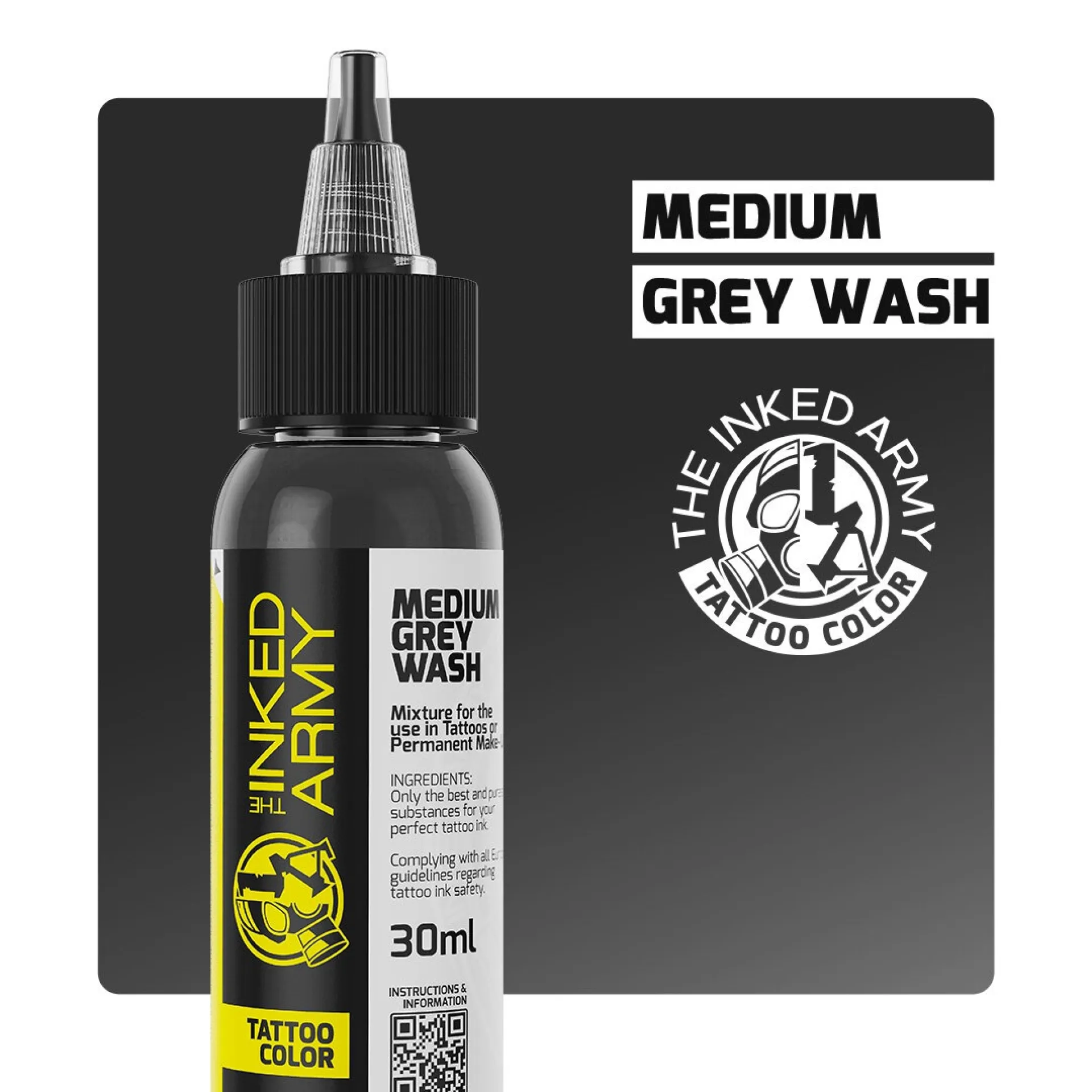 - MEDIUM GREY WASH – средно интензивен сив нюанс, подходящ за портрети, мандали или класически black & grey татуировки. Създава мост между светлите и тъмните тонове с равномерно нанасяне.