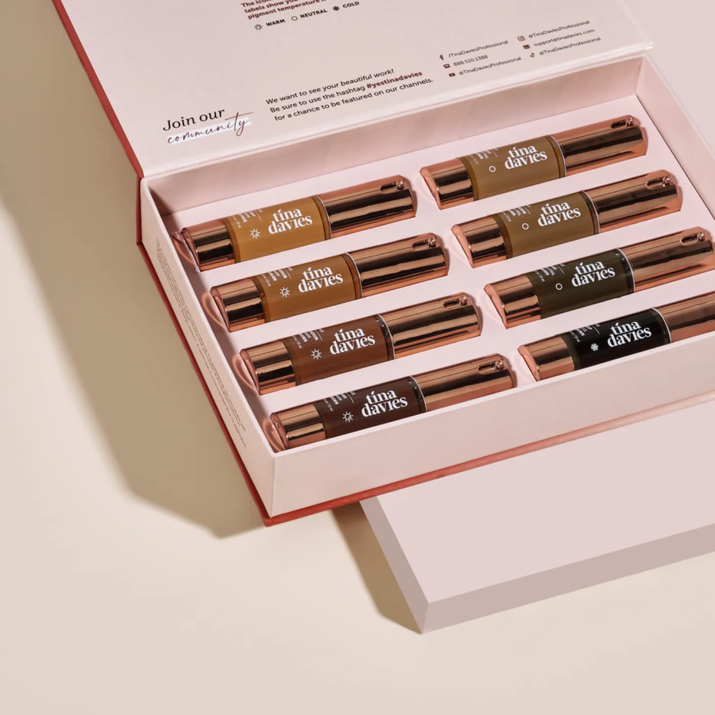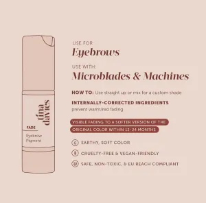 Колекцията от осем пигмента за вежди FADE на Тина Дейвис е идеална за художници и клиенти, които искат красиви вежди, без да се обвързват с доживотна форма или цвят. FADE е хибридна пигментна гама, съставена предимно от неорганични съставки. Проектиран е видимо да избледнее до по-светла версия на оригиналния цвят в рамките на 12-24 месеца след нанасяне, но резултатите ще варират в зависимост от клиента и техниката. Пигментите FADE са в съответствие с регламента на ЕС REACH.