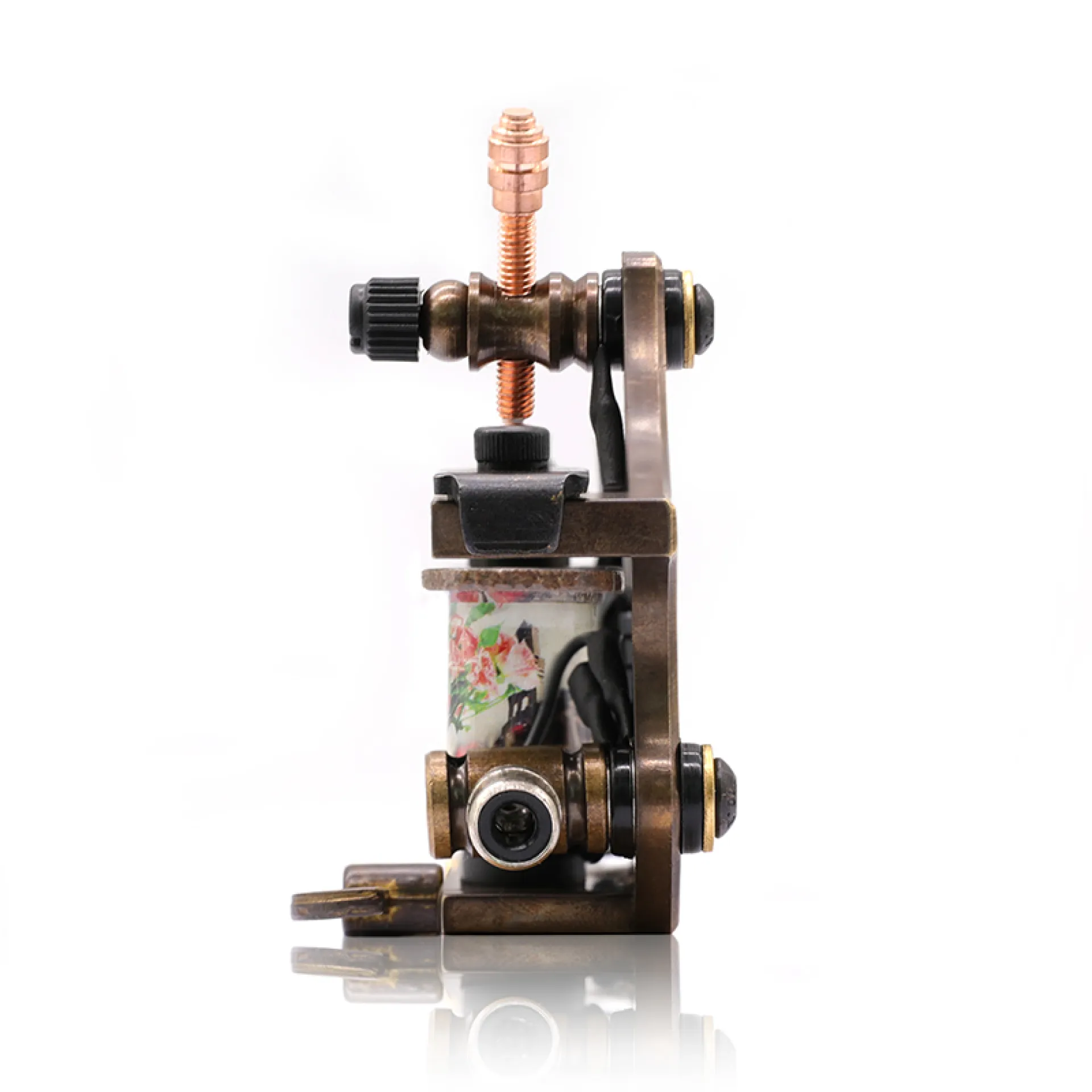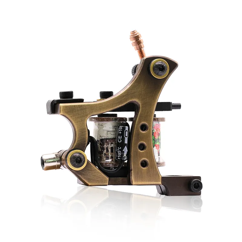 Машина за татуировки с бобина – класика, която никога не омръзва. Рамката е изработена от месинг с помощта на CNC, което придава на машината прецизни детайли във всяка посока. Оборудвана е с ръчно навити медни бобини, плочи от синя стомана и висококачествен контактен винт. Можете да свържете машината чрез класически clipcord кабел, а освен това разполага и с RCA конектор за използване с удобен RCA кабел.