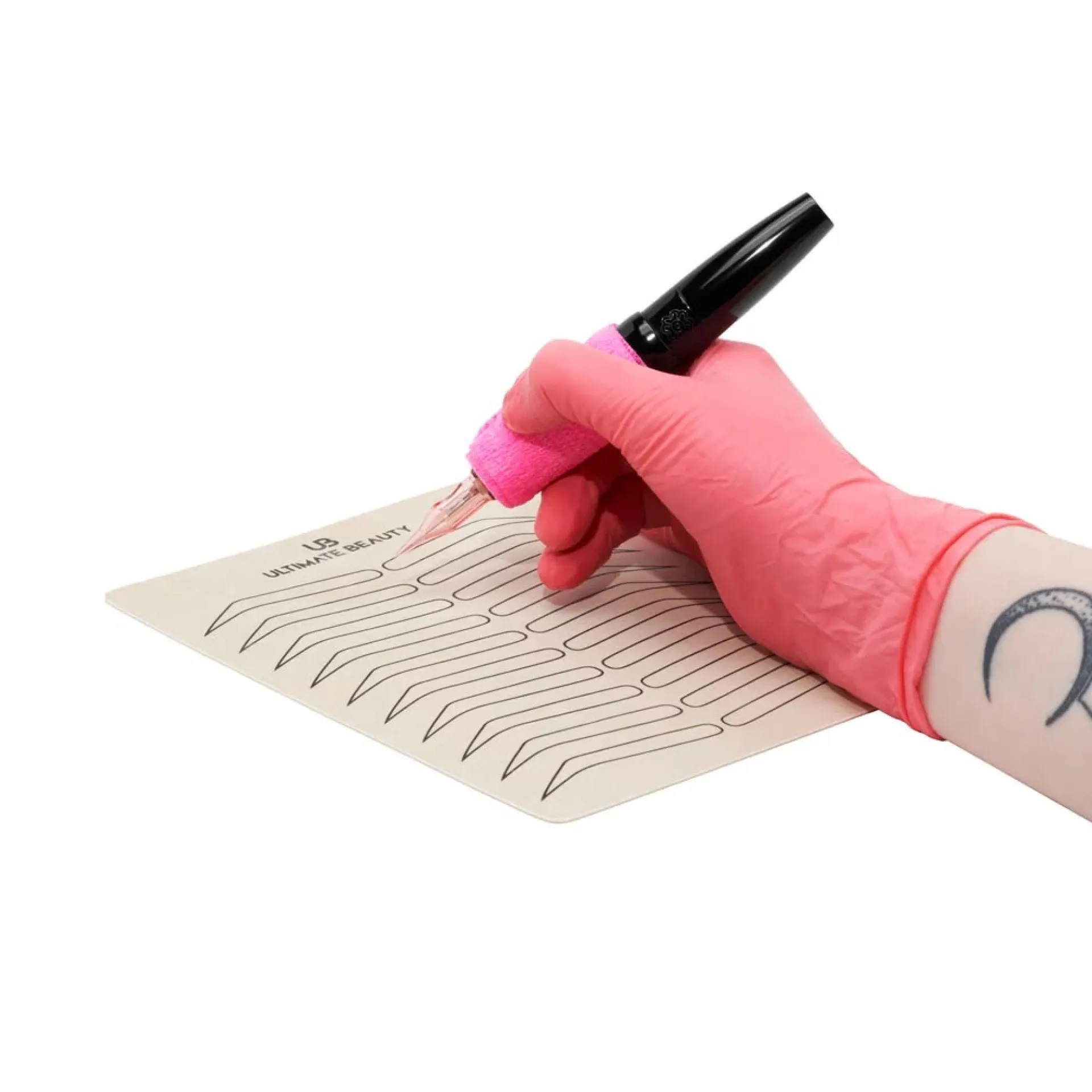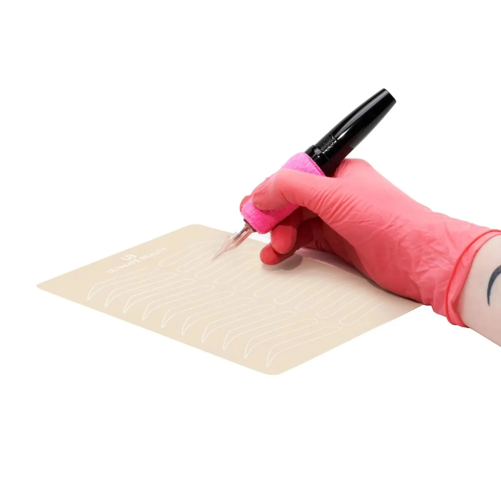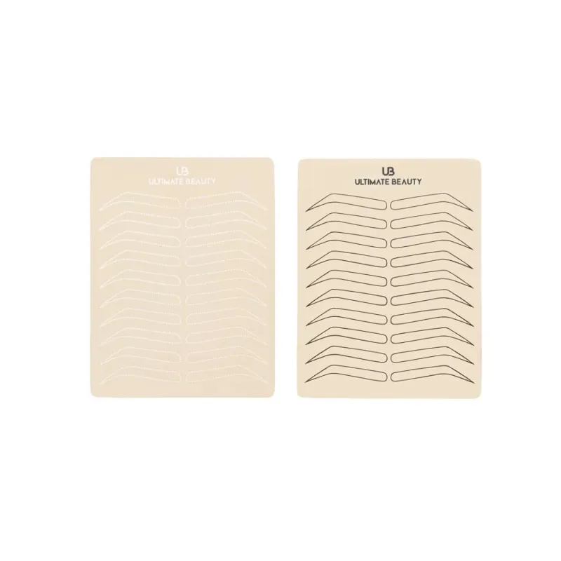 Двустранна изкуствена кожа от ULTIMATE BEAUTY с предварително очертан контур на веждите, идеална за практикуване и усъвършенстване на техниката на микроблейдинг или PMU. Може да се използва с пигмент или без него.