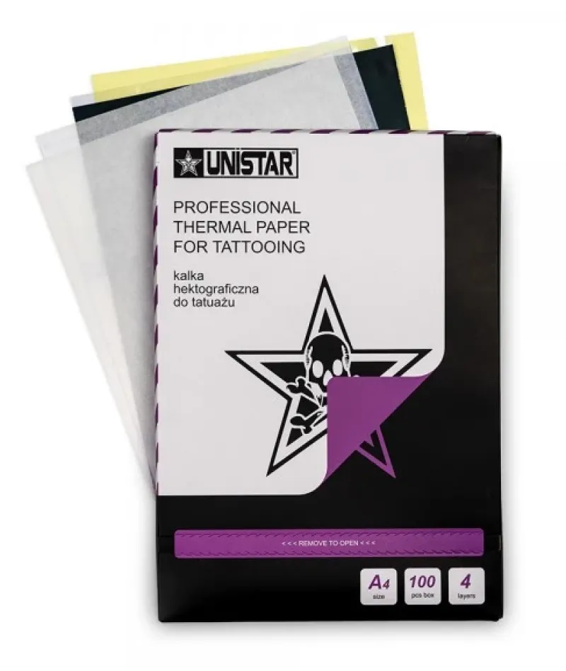 Хартията UNISTAR от производителя Kwadron е хартия, предназначена за термопринтери, но разбира се, може да се използва и за ръчно рисуване на вашите мотиви. Благодарение на използването на подходящ восък, хартията Unistar е много чувствителна на натиск, което гарантира точността дори на най-детайлните шарки. Висококачественото багрило остава върху кожата дълго време след печат и е устойчиво на износване.