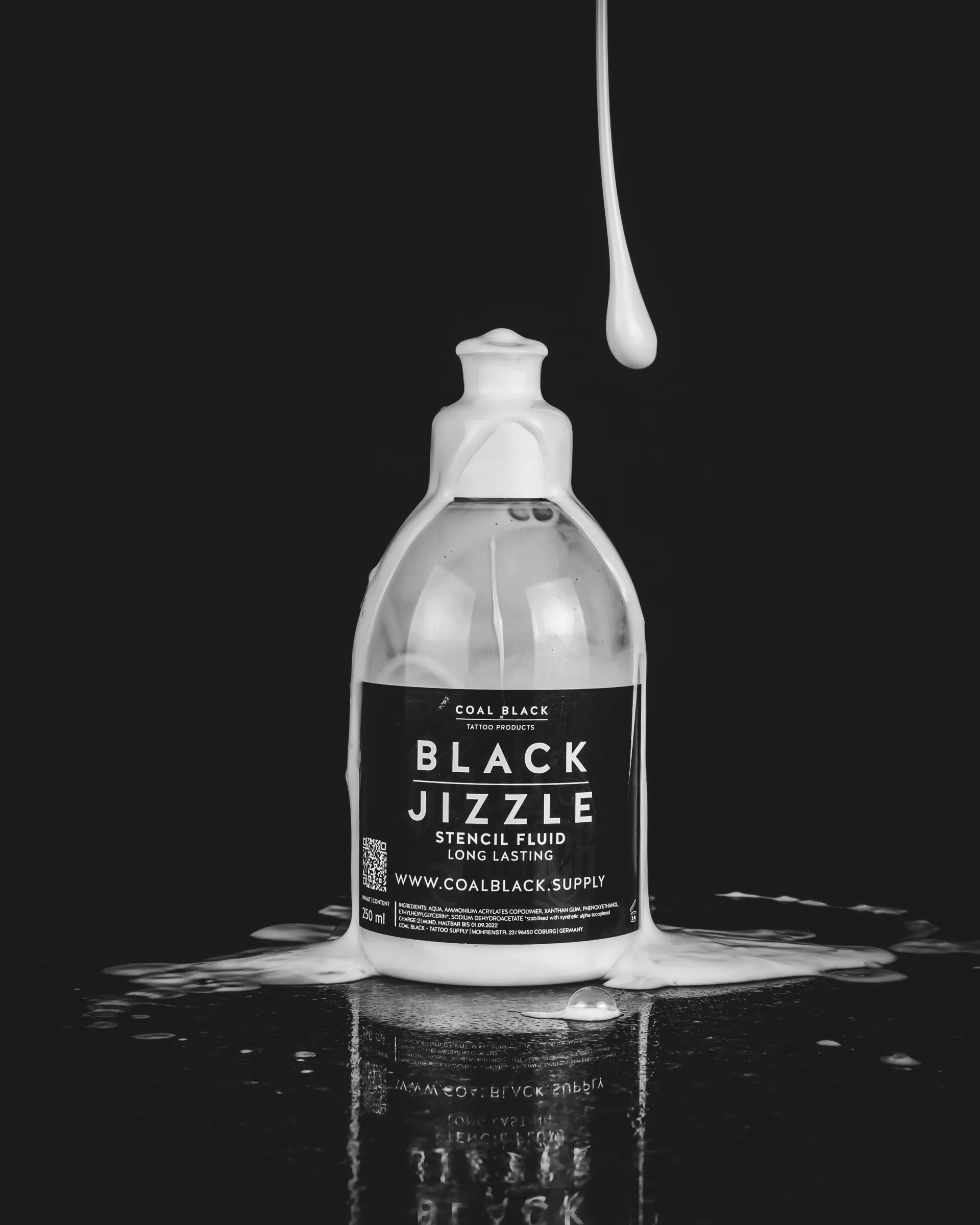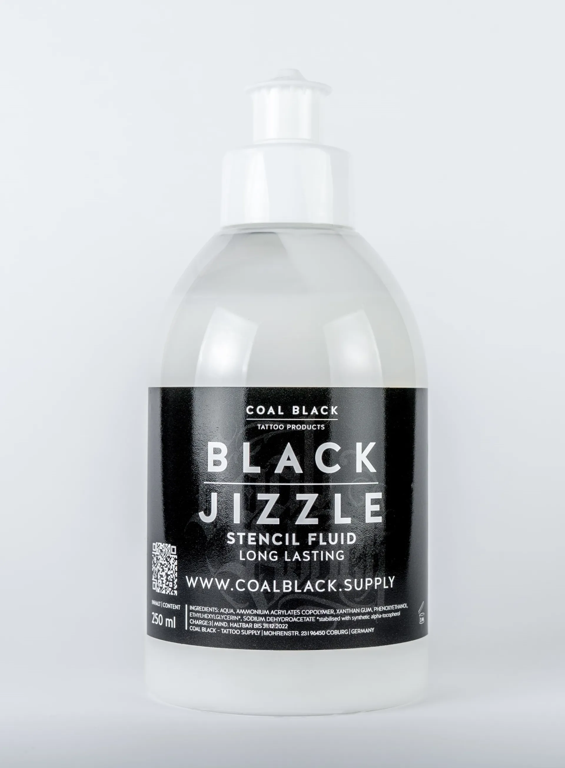 Black Jizzle е най-добрият избор, ако търсите продукт за трансфер, който е дълготраен, бърз и не изисква голям обем за нанасяне. Black Jizzle може да се използва върху хартии за рисуване на ръка и разбира се с шаблони от термопринтер. И при двата вида се нанася количество с размер на грахово зърно, така че една опаковка от 250 мл е достатъчна за нормално студио за татуировки за приблизително 6 месеца. Дългосрочната стабилност, дори след често избърсване, е даденост. Освен това, в сравнение с други продукти, Black Jizzle е уникален с това, че създава защитен филм върху кожата след нанасяне, което значително улеснява изтриването на излишната боя от кожата и предотвратява размазването ѝ по време на работа.