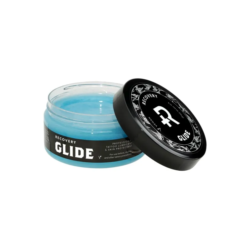 Recovery Tattoo Glide е подхранващ балсам за овлажняване, предназначен за употреба по време на татуиране и по време на лечебния процес на прясна татуировка. Обогатен е с натурални, успокояващи съставки като масло от ший, жожоба маслиново и лавандулово масло, които подхранват и защитават кожата. Витамин Е придава на балсама интензивни хидратиращи свойства, насърчава регенерацията на кожата и намалява раздразненията. Балсамът предпазва и успокоява раздразнената кожа, насърчава правилното заздравяване, осигурява смазване, без да запушва иглите, и не изтрива шаблона.
