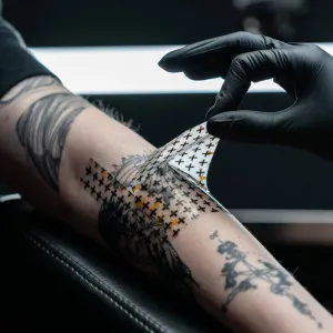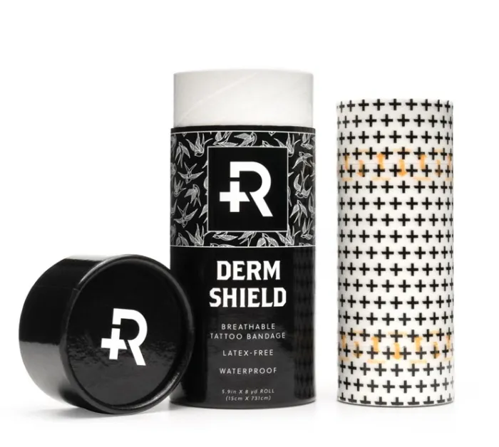 Фолио за лесна грижа след татуировка, което насърчава комфортен и хигиеничен процес на заздравяване с минимално образуване на струпеи. Recovery Derm Shields е леко и водоустойчиво фолио с полупрозрачна хартия и матово PU фолио, което предпазва кожата от бактерии, замърсявания и ожулвания. Защитното фолио е прозрачно и действа като втора кожа, за да предпази татуировката, докато тя заздравява. Derm Shield не съдържа латекс и е създаден за максимална пропускливост и гъвкавост. Може да се нанесе след почистване на прясно нанесена татуировка, като се отлепи подложката и се нанесе с лек натиск от центъра към краищата.