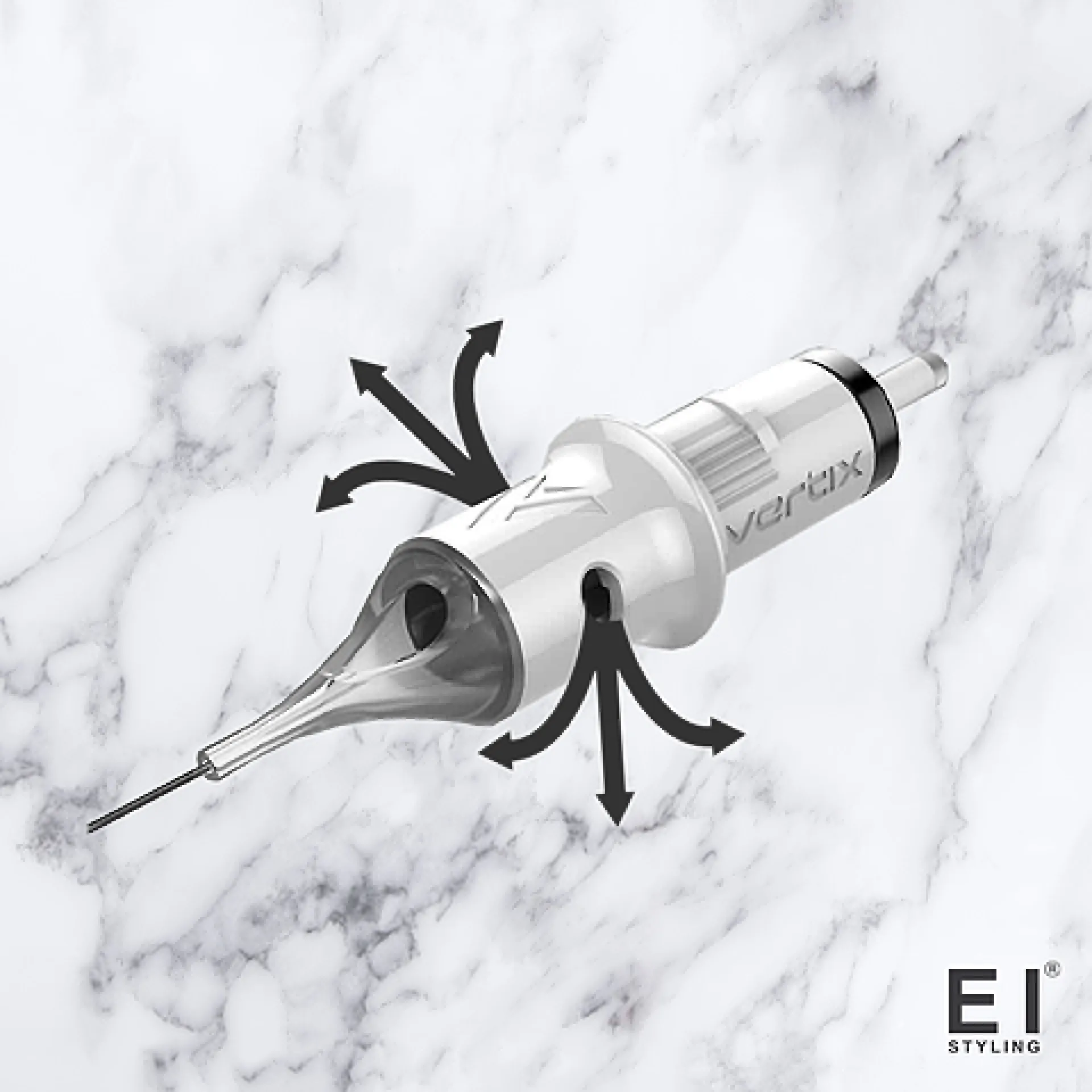 Долната част на иглата е изработена от прозрачна фармацевтична пластмаса, което ви осигурява перфектна видимост към върха на иглата. Специално проектираната форма задържа повече пигмент в пластмасовото тяло, докато горните отвори от двете страни могат перфектно и бързо да почистят иглата при изплакване. Разбира се, има предпазна мембрана, която предотвратява навлизането на кръв, боя или вода в корпуса на машината. Освен това, патроните VERTIX използват специална мека мембрана, която не натоварва двигателя на движение, както е при твърдите гумени мембрани. Освен това, меката мембрана значително намалява вибрациите по време на работа. Всеки тип е цветно кодиран, така че лесно можете да идентифицирате иглата по време на работа, без да се налага да четете блистера.