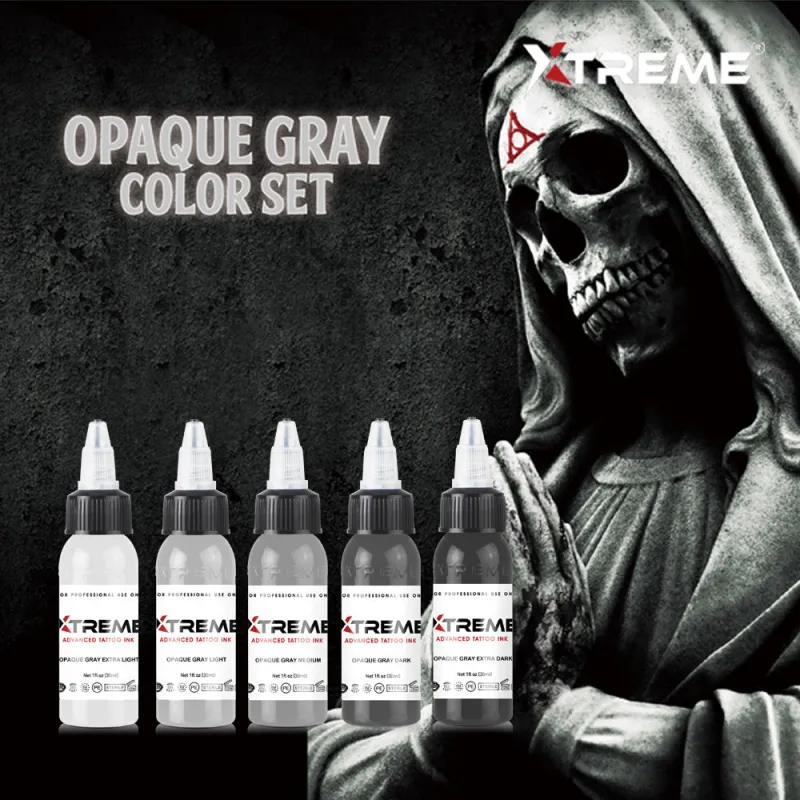 - Комплект сиви нюанси с перфектно покритие. Тези нюанси са от съществено значение за цветовата палитра на всеки татуист. Чудесени за създаване на плавни непрозрачни преходи или омекотяване на всеки цвят без промяна на нюанса